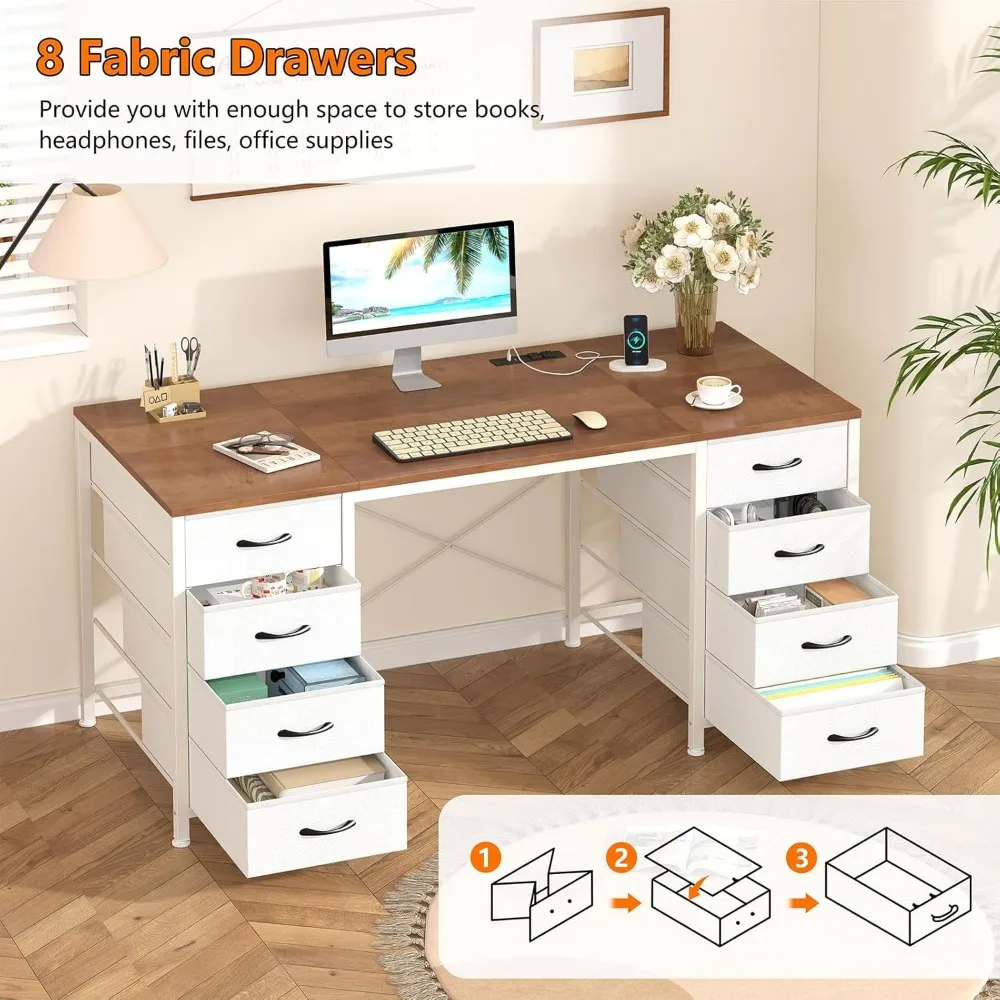 - DESK WITH 8 DRAWERS: This desk with storage function has 8 fabric drawers, four drawers on each side, providing you with enough space to store books, headphones, files, office supplies, etc. These drawers are lightweight and easy to pull out, allowing you to easily organize your workspace