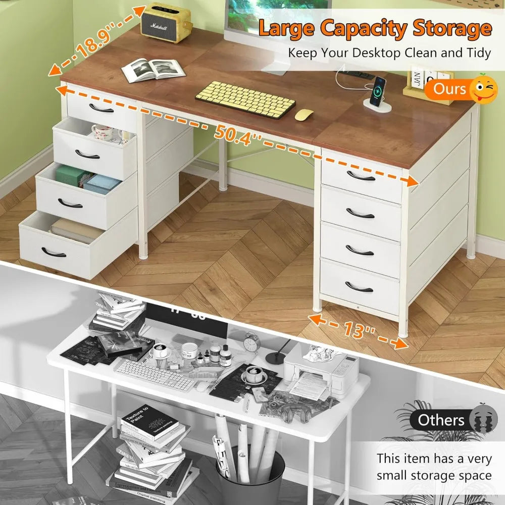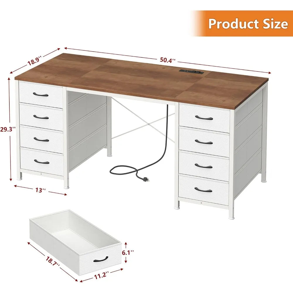 50 Inch Computer Desk with 8 Drawers, Home Office Desk with Power Outlets, Work Study Gaming Desk with 8 Fabric Drawers, Brown a