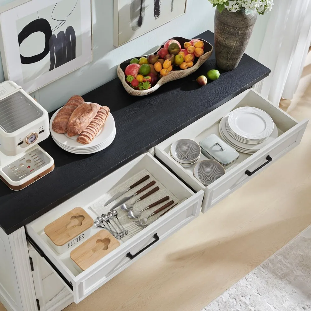 - Stunning Buffet Sideboard: Our Farmhouse Buffet Sideboard Cabinet is designed in a beautiful and elegant farmhouse style, adding a charming and rustic touch to any dining room or living area.