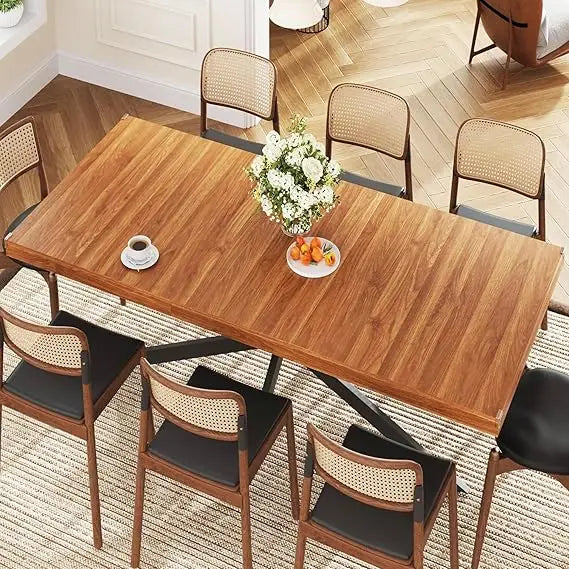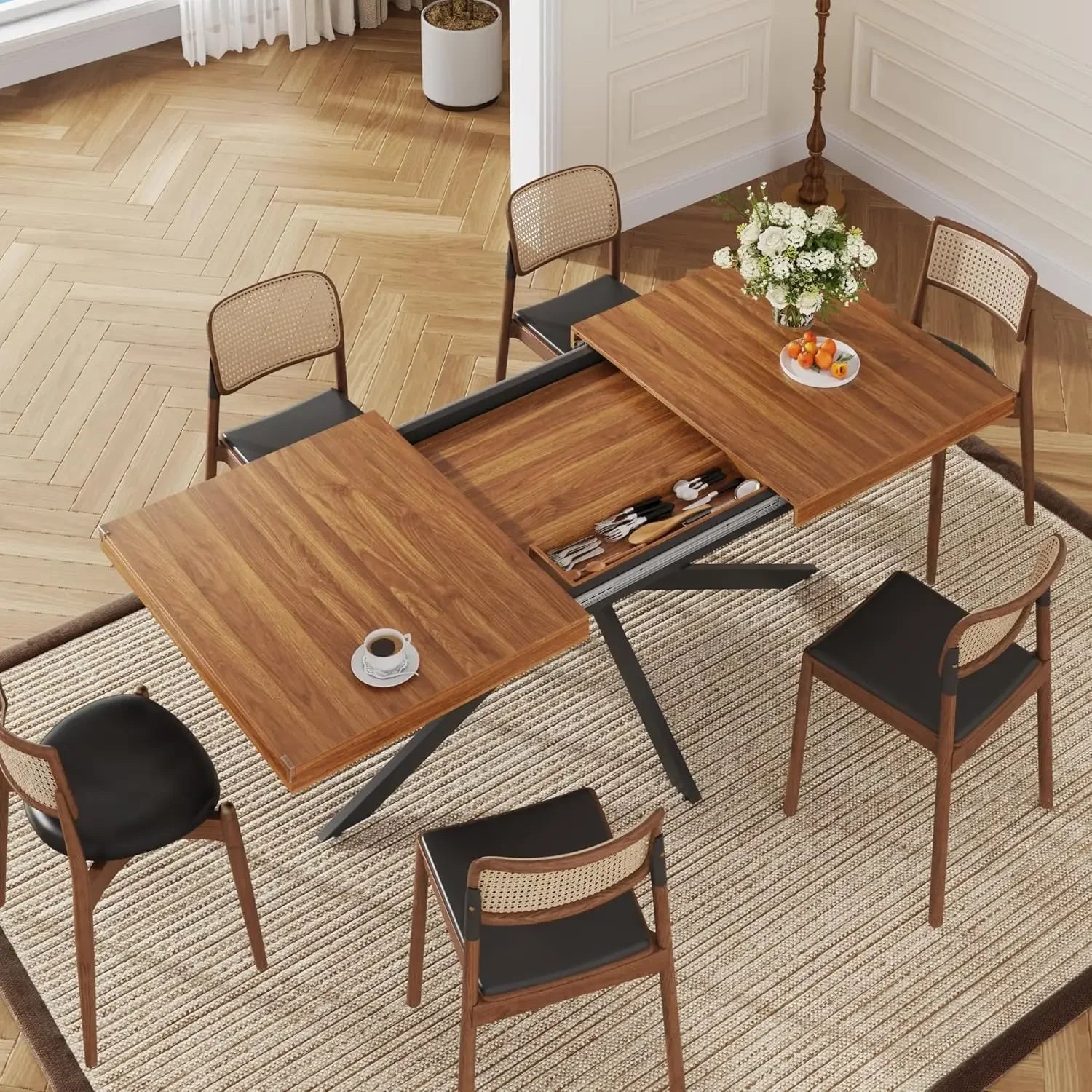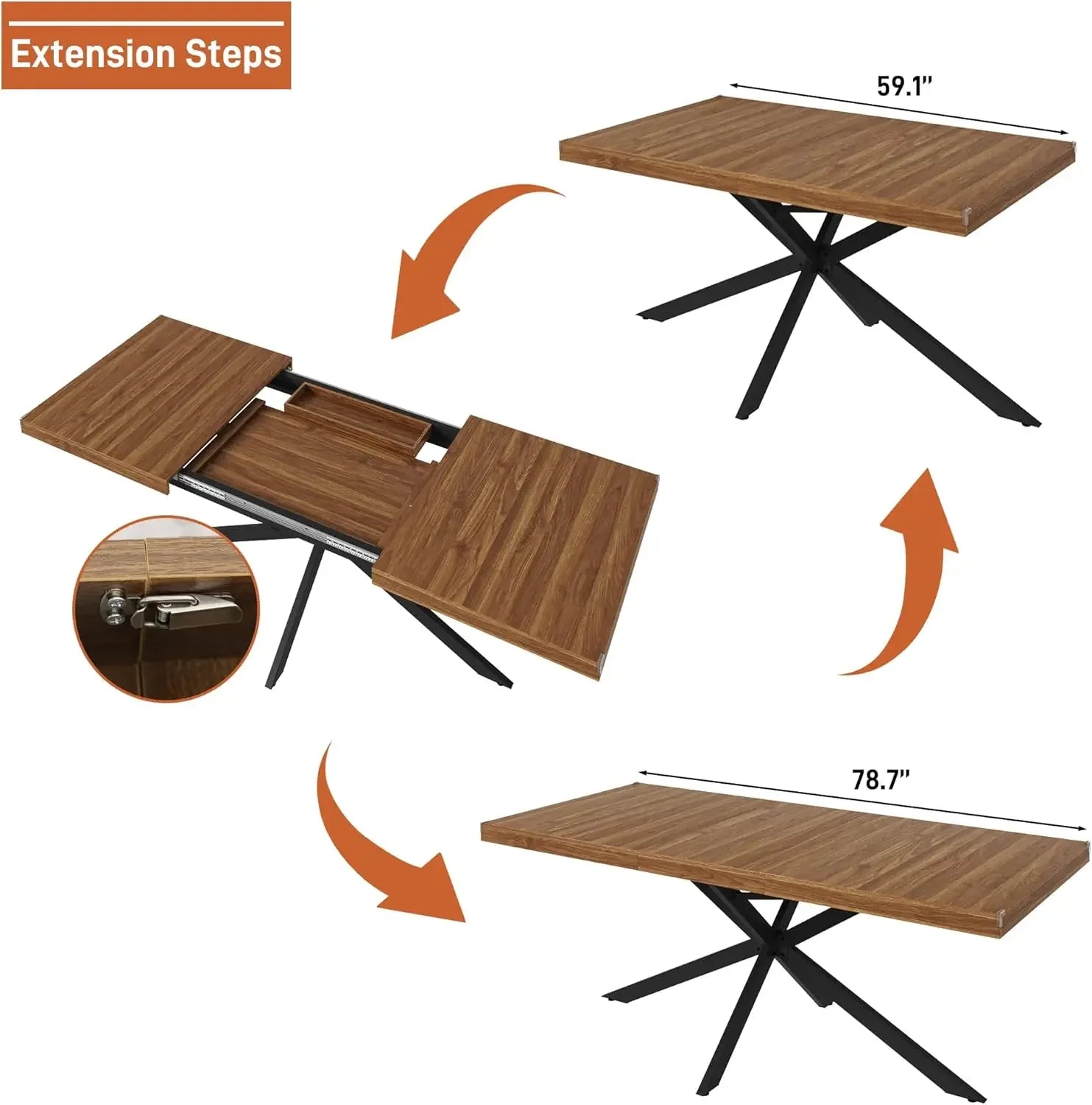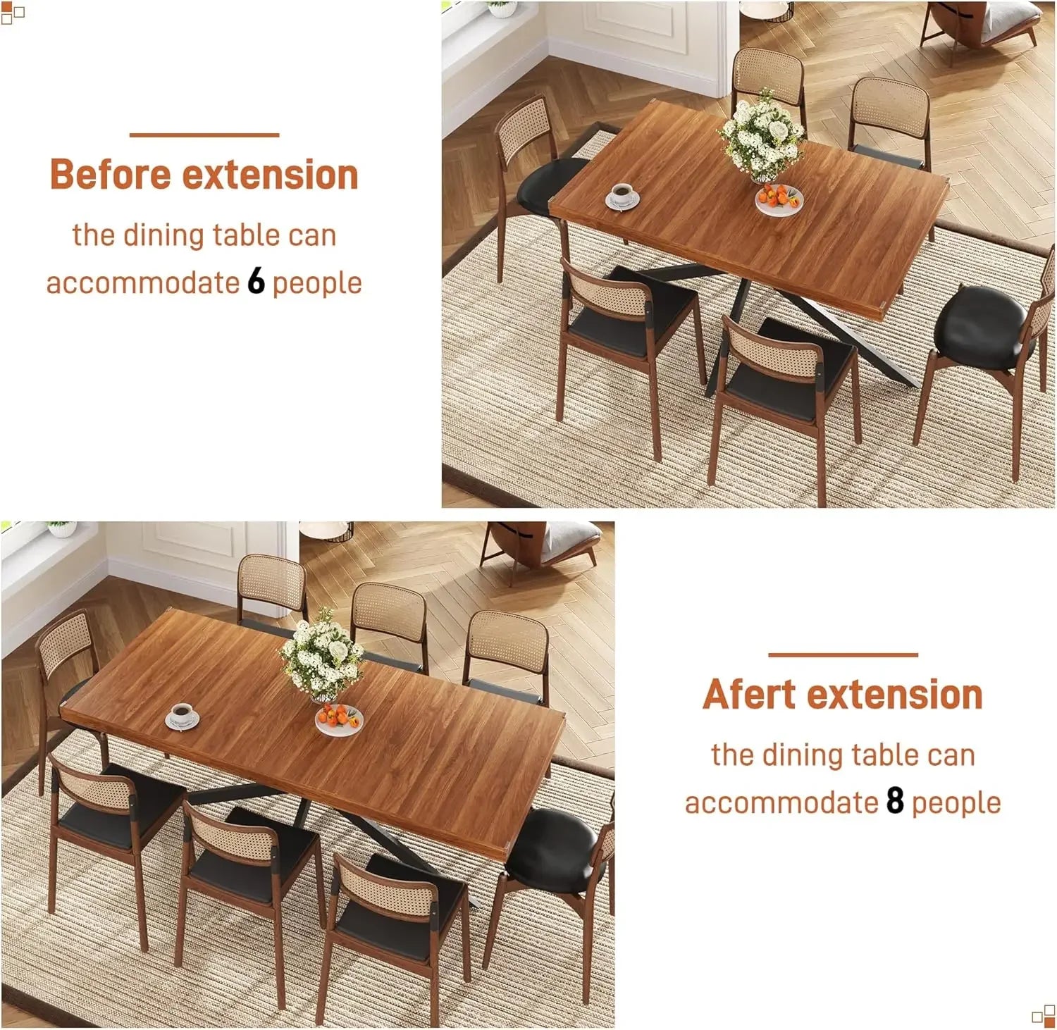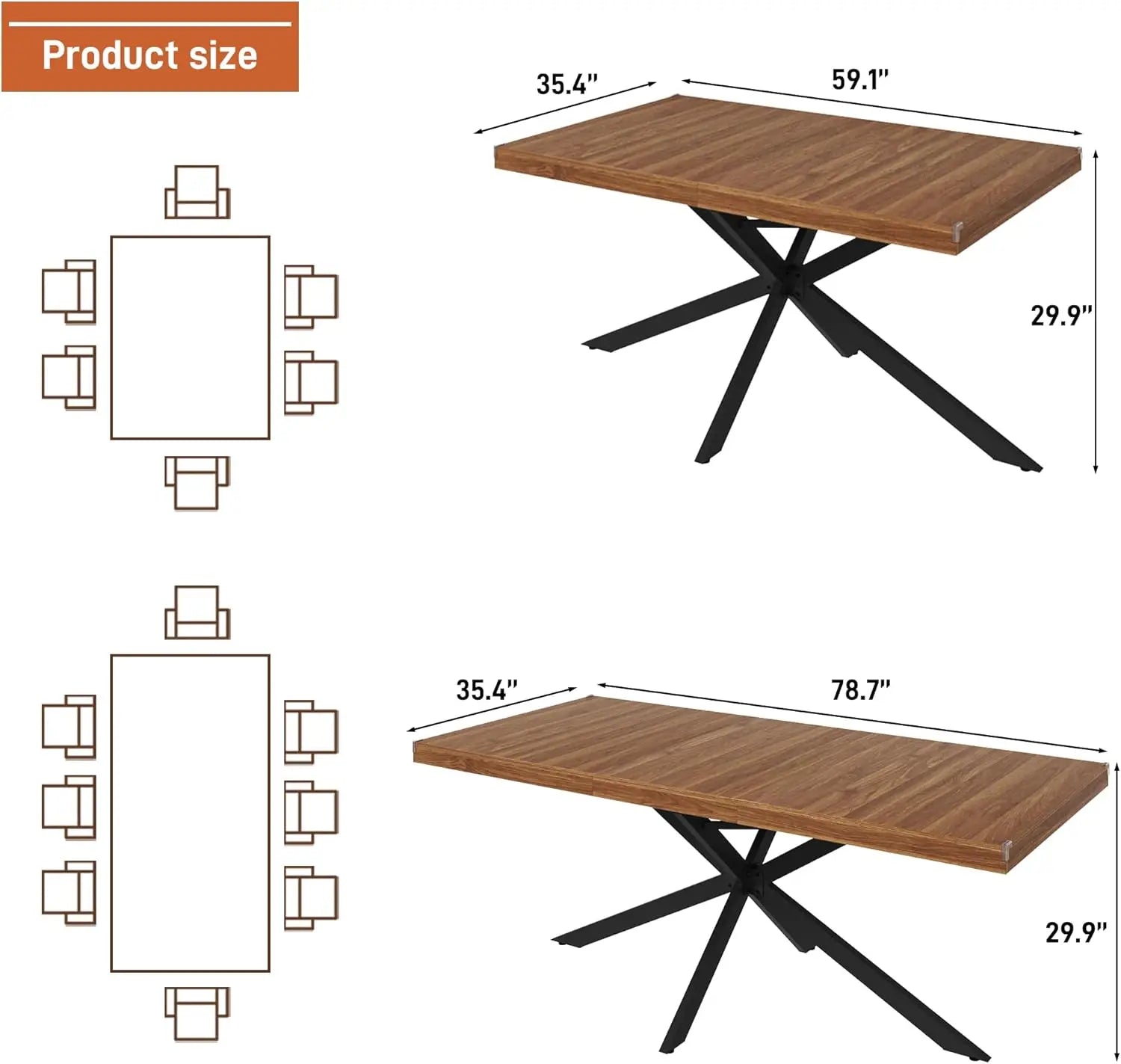 This walnut extendable dining table is a versatile piece of furniture designed to accommodate both intimate meals and large gatherings. It features an extendable top that can be adjusted to seat 6 to 8 people, with dimensions of 35.4 inches in width and a length that ranges from 59.1 to 78.7 inches, all with a height of 29.9 inches. The table boasts a stable and secure construction, with X-shaped metal support legs and horizontal fixed metal tubes that prevent shaking. It can support up to 500 pounds, and its adjustable feet ensure stability on uneven surfaces. The tabletop is crafted from engineered wood, which is heat-resistant, making it durable and safe for everyday use. Its multifunctional design allows it to blend seamlessly with various decor styles, making it suitable not only for dining rooms and kitchens but also for meeting rooms and small living areas. The table also offers practical convenience with a hidden storage compartment under the tabletop, perfect for keeping tableware, tablecloths, and board games. The compartment's foldable flap design allows for easy storage when not in use. We take pride in our quality assurance, with each package being inspected before shipping and accompanied by clear instructions and assembly videos for a hassle-free setup. The extendable dining table is crafted from FSC certified wood, ensuring environmental sustainability and peace of mind with your purchase.