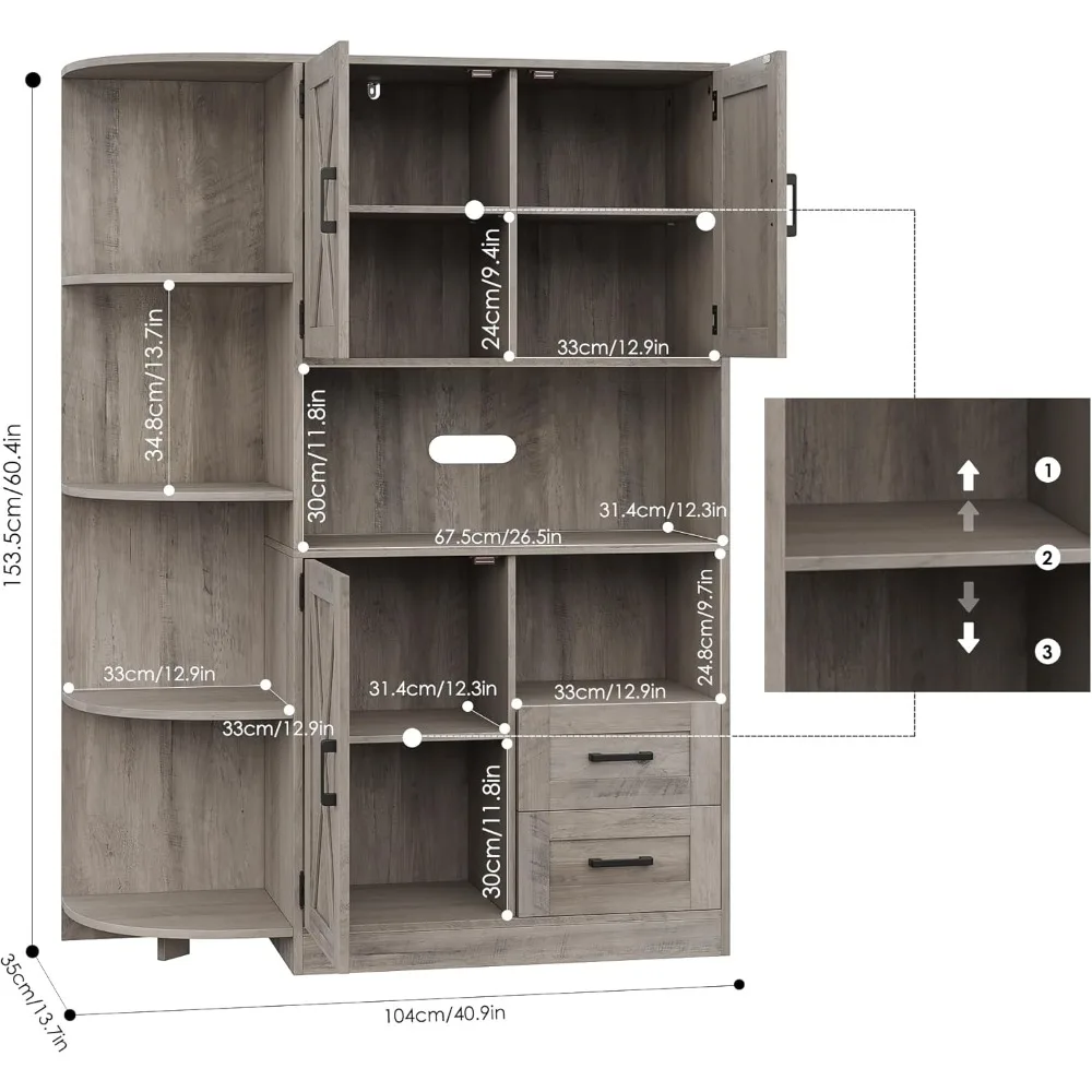 - UPGRADE YOUR KITCHEN STORAGE: Featuring ample compartments, three cupboards each with adjustable shelf, a 4-tier external shelf and 2 easy-glide drawers, this functional buffet cabinet provides both open areas and hidden spaces to keep all your kitchen appliances and cooking accessories well organized