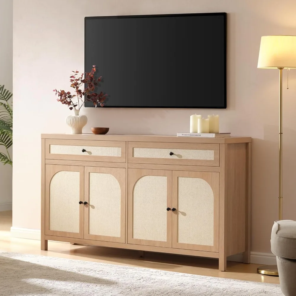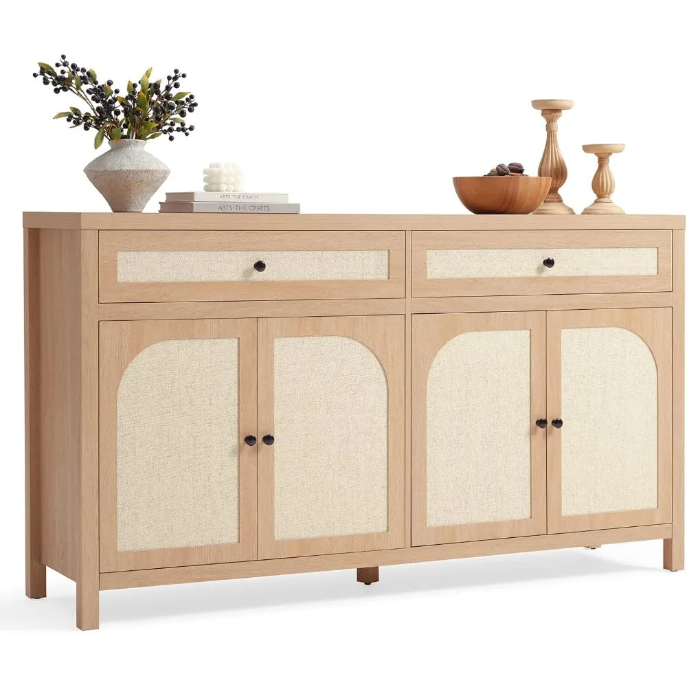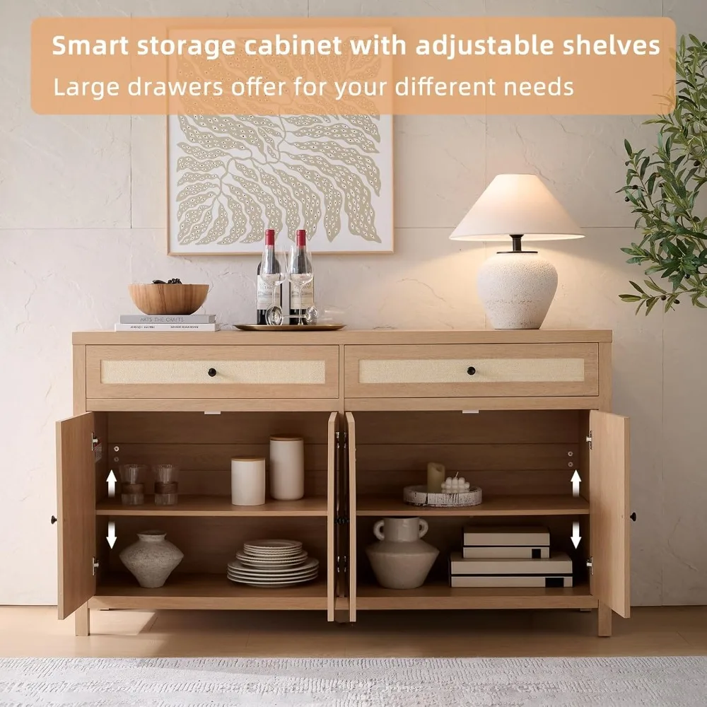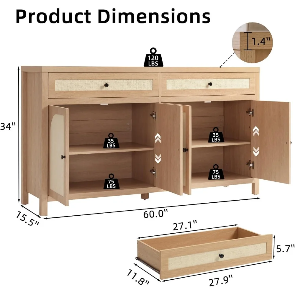 60'' Large Sideboard Buffet Cabinet with Storage,Rattan Accent Cabinet with Doors Drawers and Adjustable Shelves,Farmhouse
