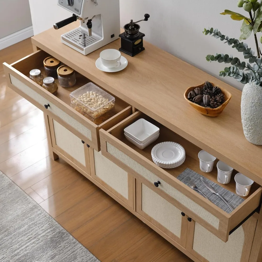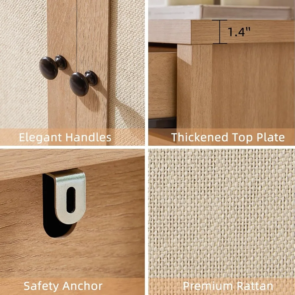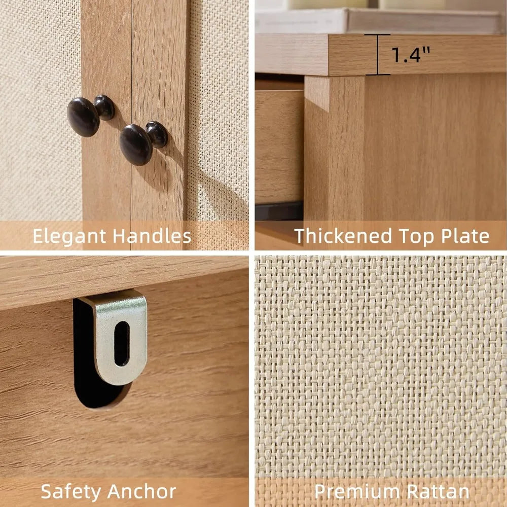 【Sturdy Rattan Construction】Crafted from premium MDF and natural rattan, this reinforced buffet cabinet features 5 thickened legs (1.77"+). With a weight capacity up to 120lbs (54kg), it ensures exceptional stability and durability for long-term use