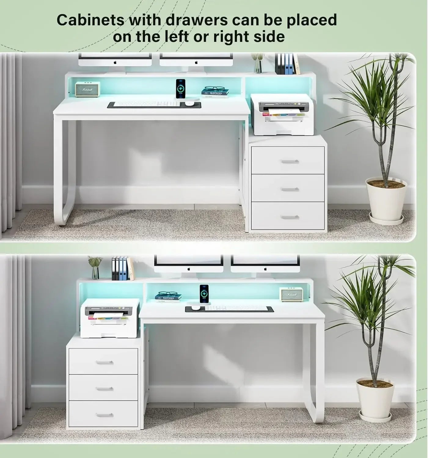 67" White Desk with 3 Drawers and Storage, White Office Desk Computer Desk for 3 Monitors, Reversible Home Office Desk with LED Strips and Printer Standfor Bedroom