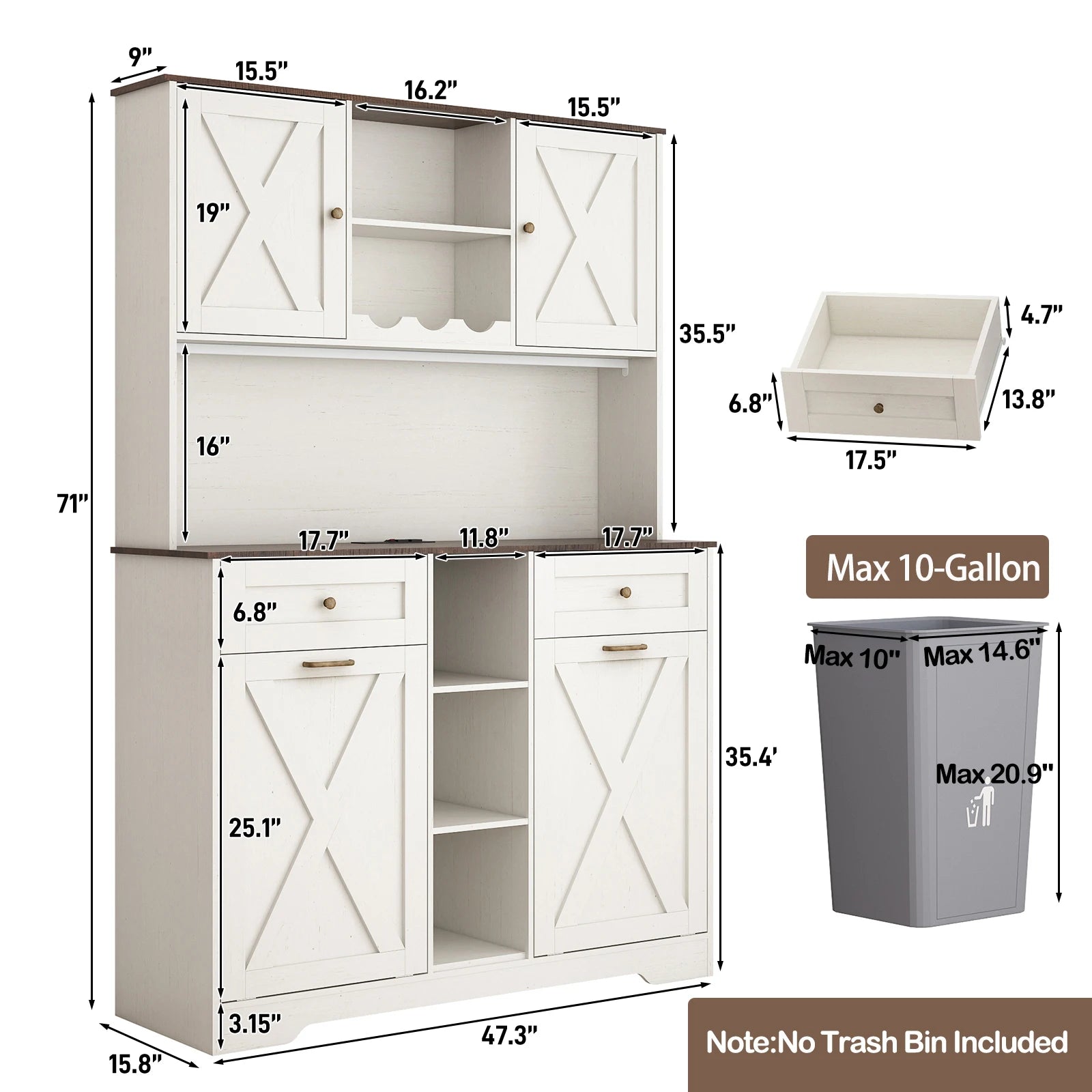 Multifunctional Storage Space: Kitchen trash cabinet composed of a wide countertop, upper hutch, 2 storage drawers and 2 hidden trash holder. Wide countertop is perfect to store oven, microwave, coffee maker or whiskey. The upper storage compartment features two open shelves and two closed storage spaces, and 2 large storage drawers. Allowing you to classify kitchen utensils, jars, snacks, liquor orderly.