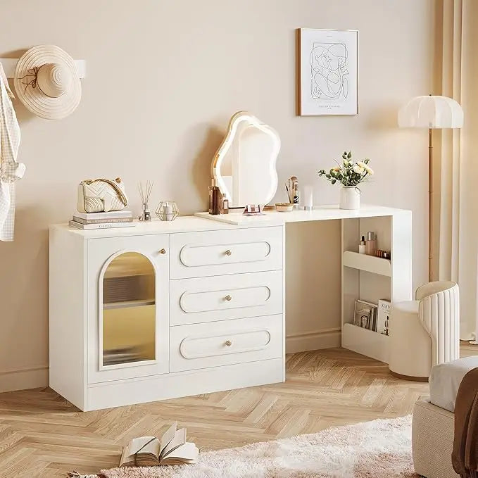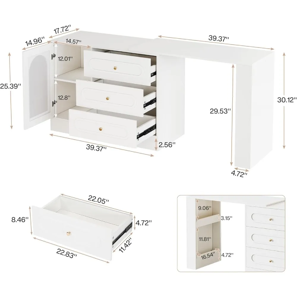 This vanity offers ample storage with three large drawers, a cabinet with adjustable shelves, and an open compartment, perfect for organizing makeup and hair tools. The adjustable shelves accommodate tall bottles and beauty devices, ensuring a tidy storage solution. The vanity features a modern and elegant design with embossed patterns, gold-tone handles, and a sleek white finish, blending well with both contemporary and classic decor. The 360° rotating tabletop allows for versatile use in any space, from small apartments to spacious bedrooms. The clear acrylic panel on the cabinet door provides a stylish display for your favorite perfumes, skincare products, and accessories, offering easy access without the need to open every drawer. The vanity also boasts smooth and quiet metal slides for the drawers, ensuring a peaceful and convenient beauty routine.