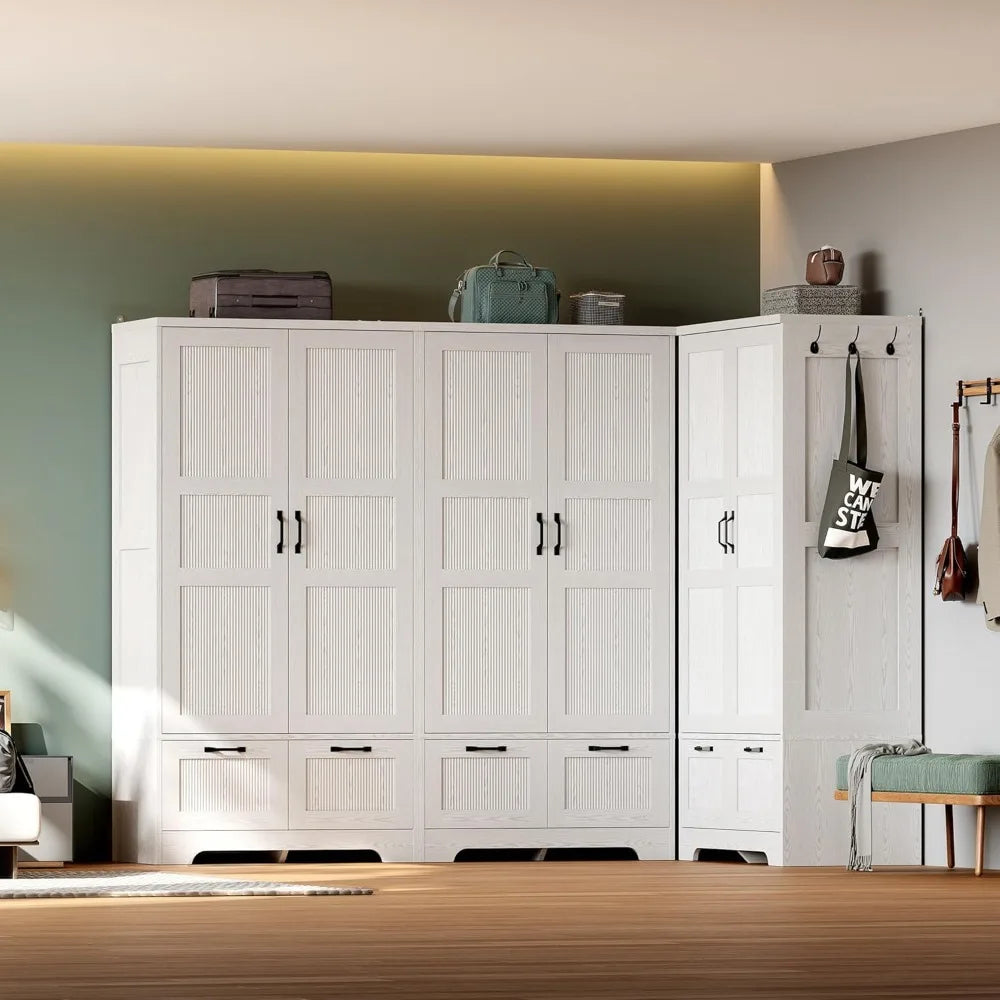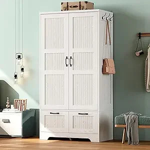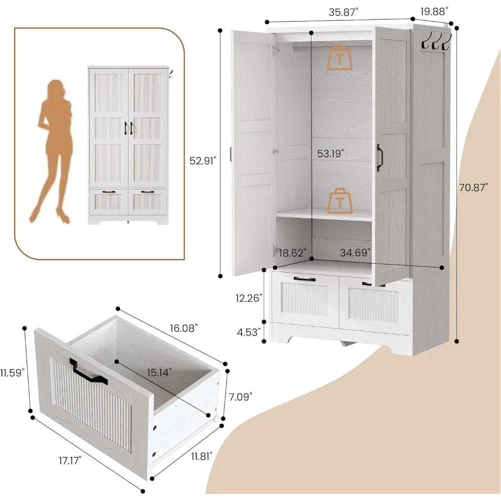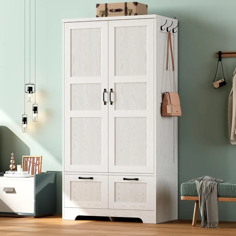This armoire provides ample storage space, standing at 71 inches tall and 36 inches wide. It comes with a removable hanging rod and an adjustable middle shelf, which allows for customization of the storage area to accommodate clothing of varying lengths and thicknesses. There's also additional room for bags, shoes, and other items. The wardrobe is designed with versatility in mind, featuring two deep drawers that glide smoothly and three side hooks, offering extra storage for blankets, hats, scarves, wallets, and more. Its sleek and modern design, with clean vertical lines and elegant black metal handles, gives it a timeless appearance that fits well with any room's decor, providing stylish and organized storage. Made with high-quality MDF and equipped with anti-tip hardware, this clothing storage solution is both sturdy and reliable for everyday use, ensuring stability. Assembly is straightforward, thanks to numbered parts and clear, step-by-step instructions, making the process quick and hassle-free.