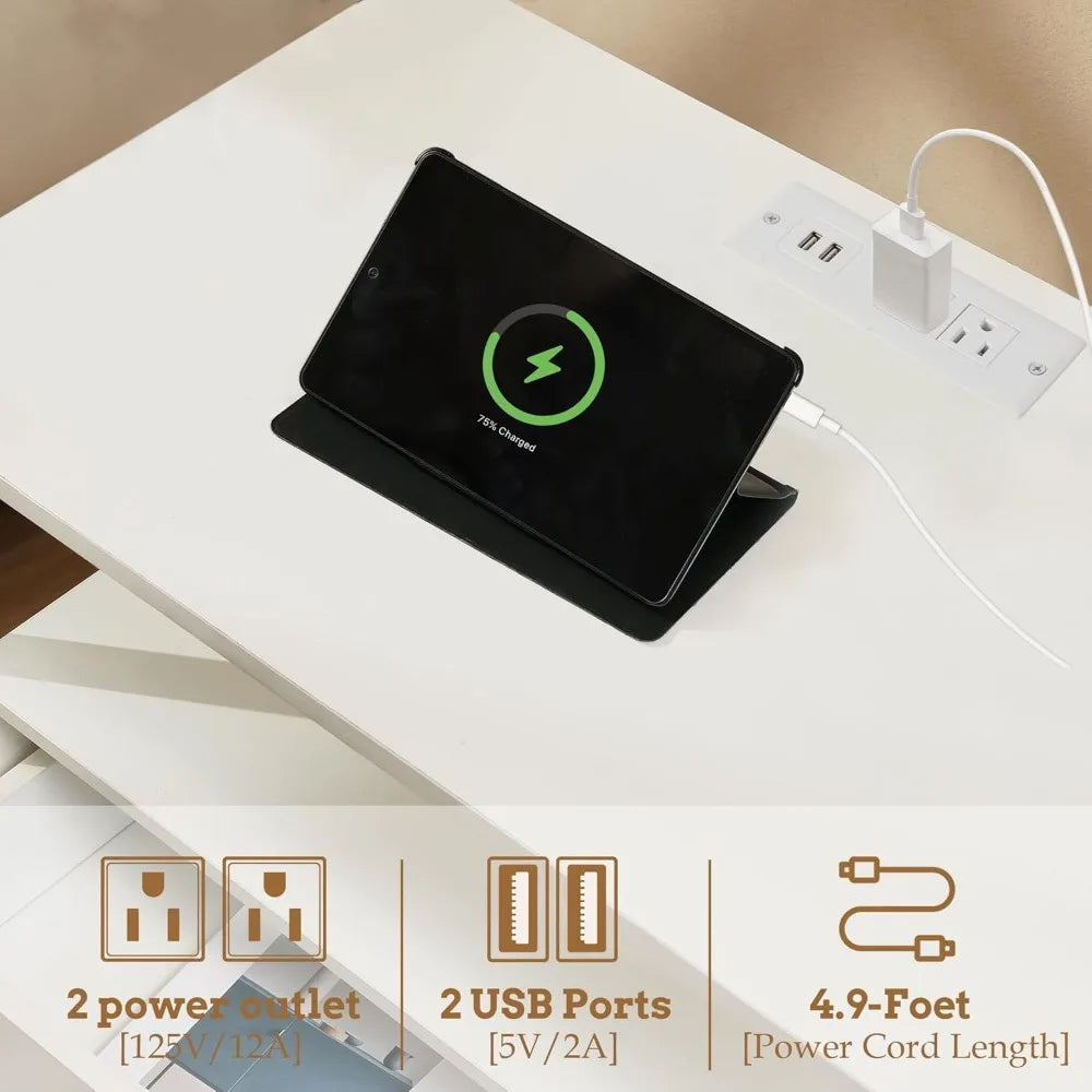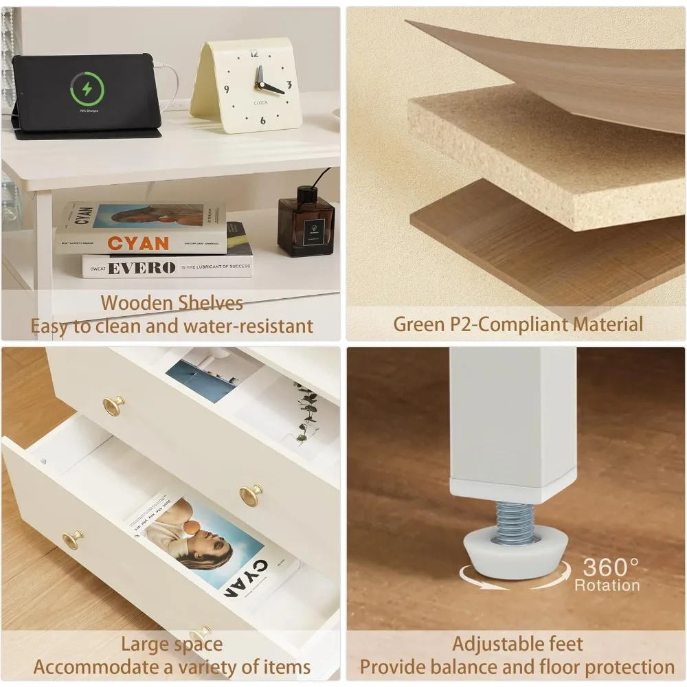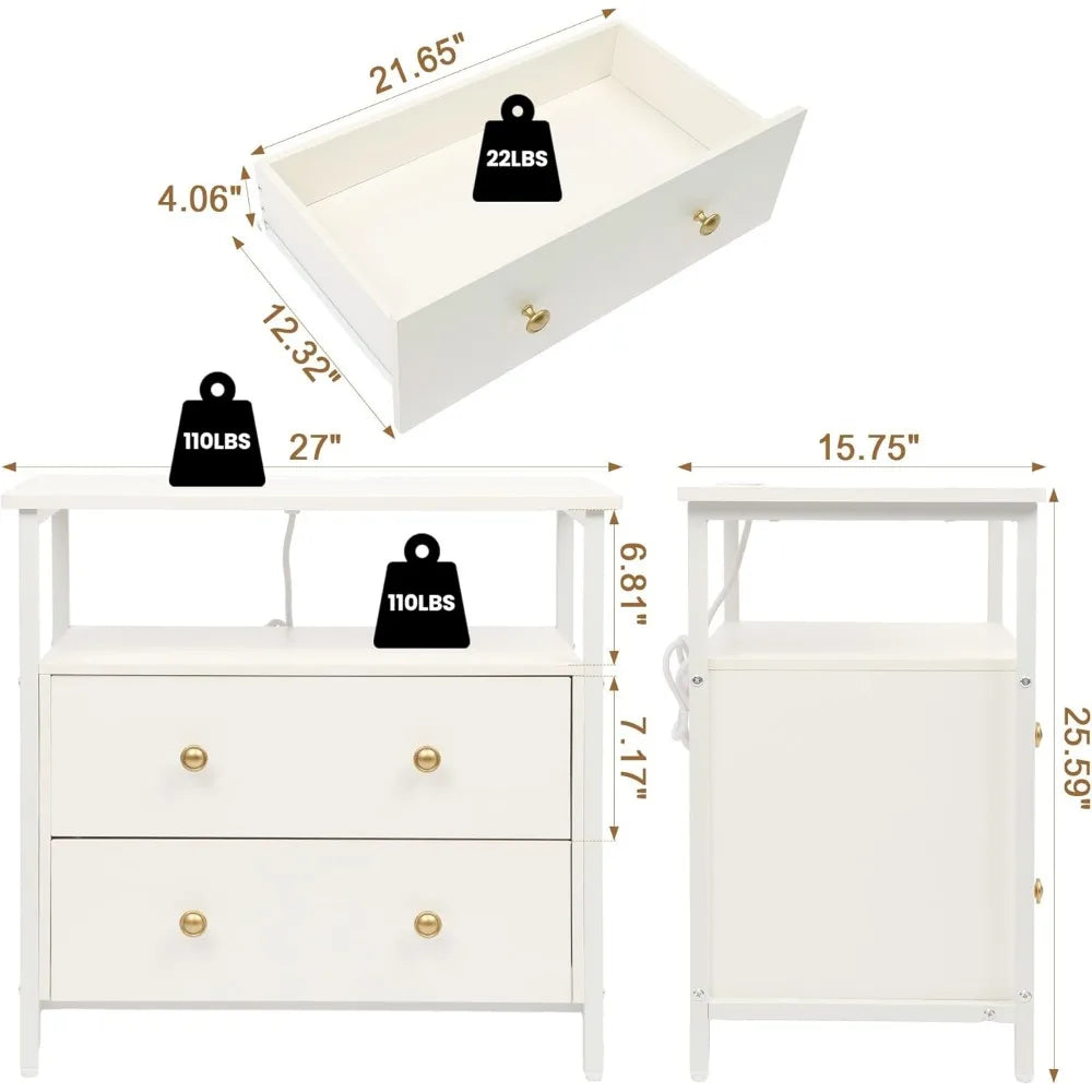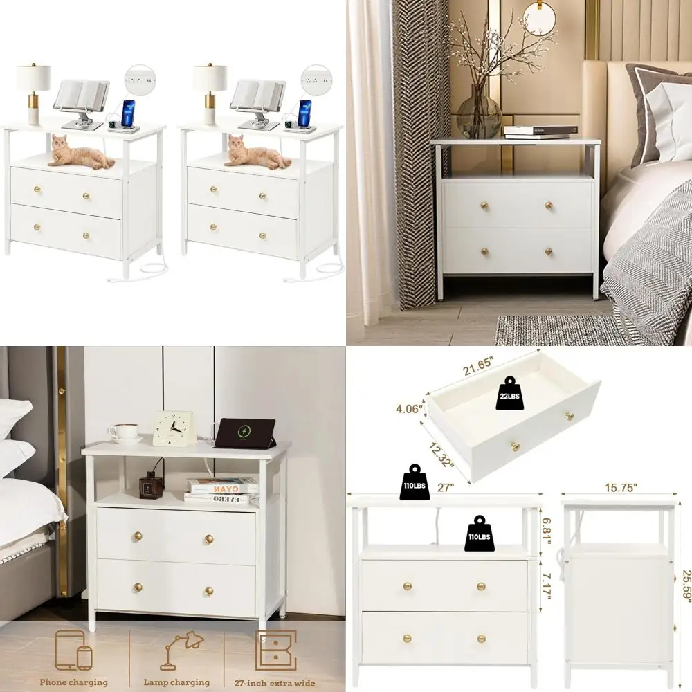 This contemporary nightstand offers a practical solution for charging and powering your devices with its dual AC outlets and USB ports, making it convenient for lamps, phones, or laptops. It boasts dimensions of 15.75 inches in depth, 27 inches in width, and 25.59 inches in height. The spacious design includes two large drawers and an open shelf, providing ample storage for books, magazines, and electronics. The top shelf can support up to 110 pounds, while each drawer can hold up to 22 pounds. Crafted from engineered wood and steel, this side table is built for durability and stability, featuring an elegantly finished wood top and adjustable feet for uneven surfaces. Its versatile design allows for use in various settings such as bedrooms, living rooms, and offices, and it can function as a bedside table, side table, end table, small dresser, or entryway table. Assembly is straightforward with included instructions, and it is recommended to have two people assemble the nightstand due to its size. An installation video is available for guidance, and assistance is provided if needed during assembly.