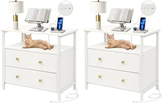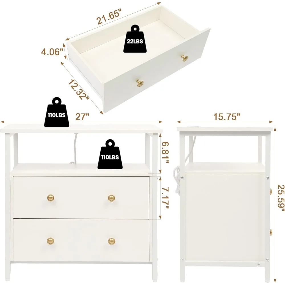 Charging Station Nightstand 27 Inch Wide, 2 Drawer Wood Bedside Table with Open Shelf, Compact End Side Table for Bedroom
