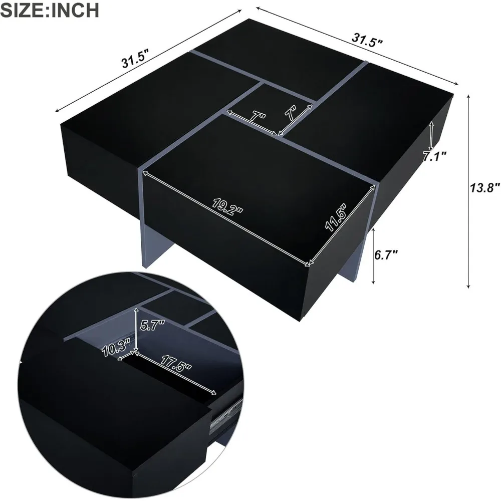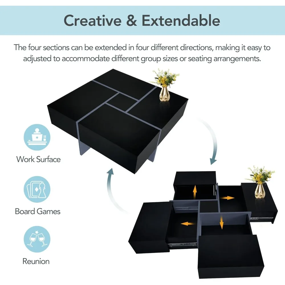 Coffee Table with 4 Hidden Storage Compartments, Extendable Sliding Tabletop, UV High-Gloss Design, 31.5"x31.5", Black