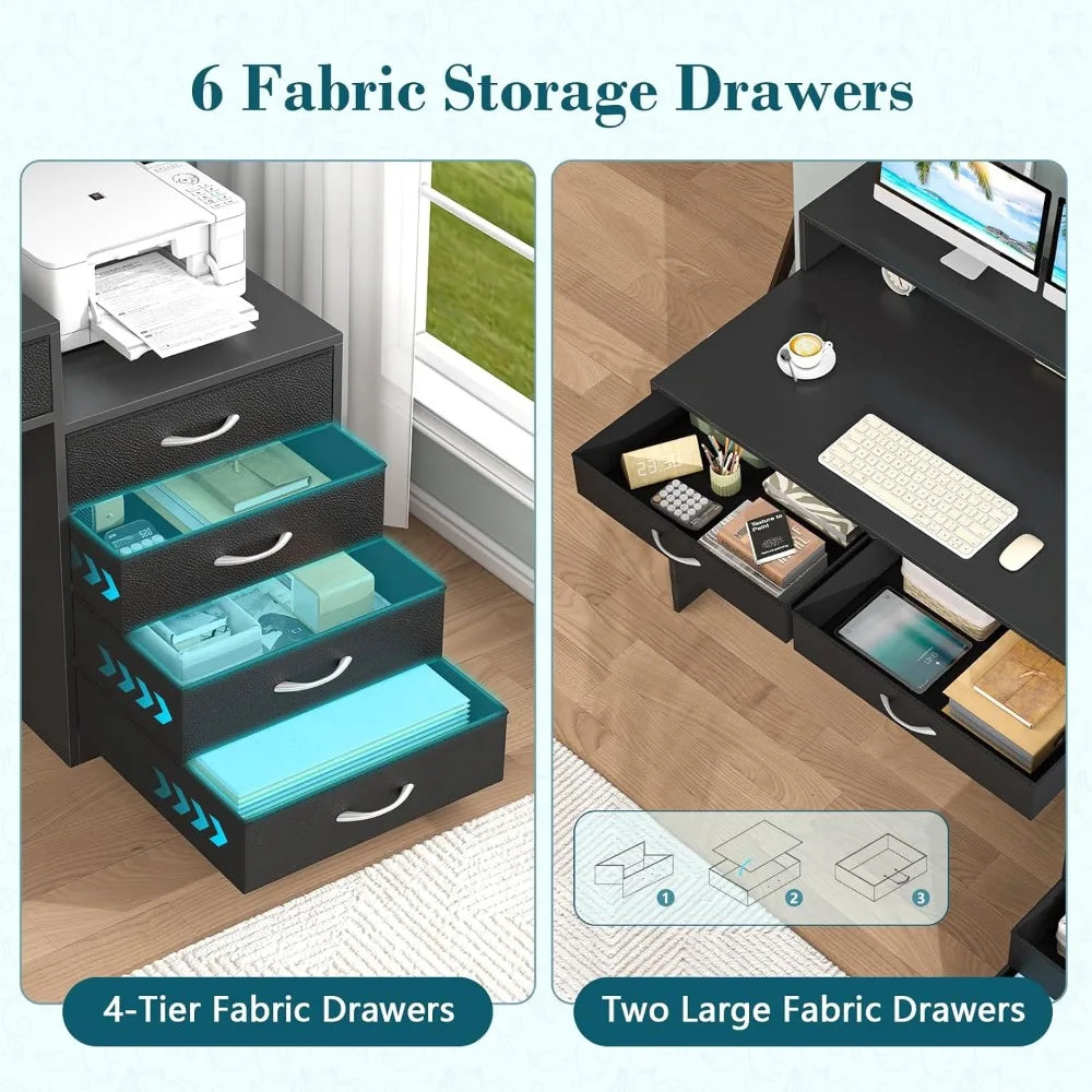 - 【Computer Desk with 6 Drawers】: The computer desk comes with 6 fabric drawers, a printer rack, and a storage shelf below. The office desk with drawers can hold office supplies such as files and notebooks, and the storage shelf below is perfect for additional storage, which can hold books, magazines, or gaming equipment