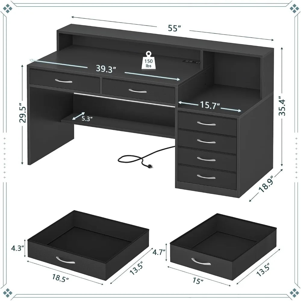Computer Desk with 6 Drawers, 55 Inch Home Office Desk with Storage, Power Outlets and Printer Stand, Study Writing Desks with L