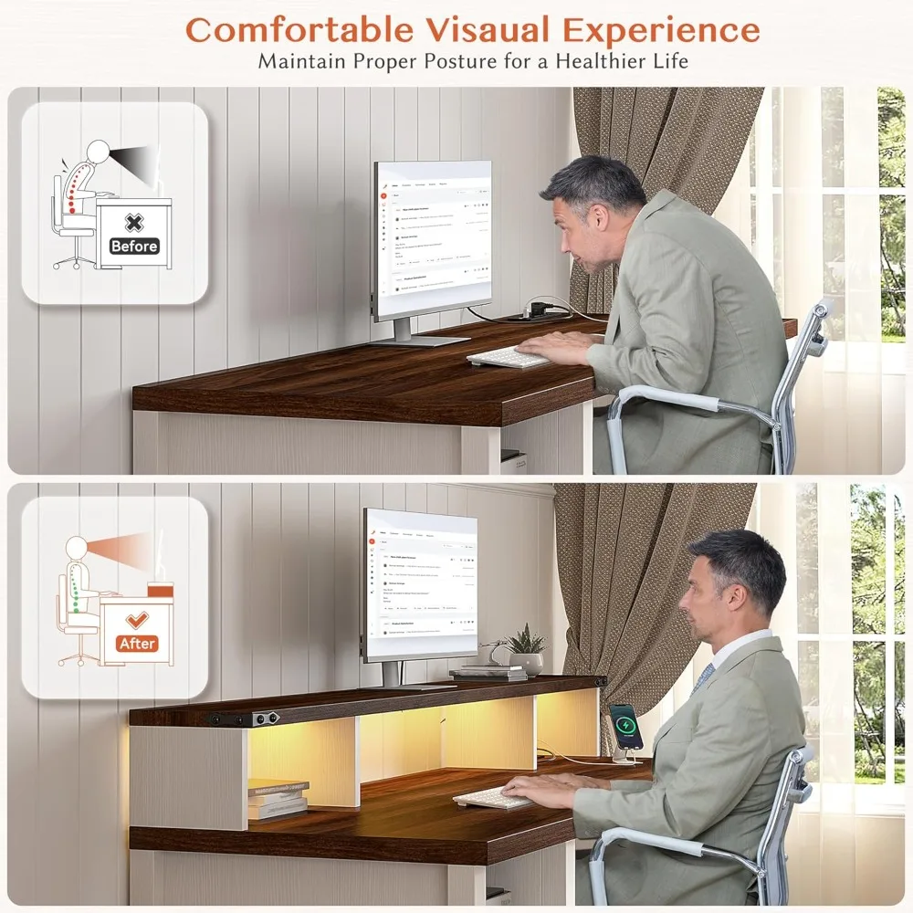 - 【Highly Comfortable to Use】The monitor shelf of this home office desks conforms to the ergonomic structure, which effectively reduces the pressure on your back and neck, so that you don't need to worry too much about health problems while working. We understand that prolonged computer use can put strain on the neck and eyes, so the elevated monitor shelf design takes into account human eye level and sitting posture, aiming to reduce physical fatigue and visual stress during use. farmhouse office desk fully meets your needs for vertical or horizontal angles. There is also ample stretching space under the desk, making it easy for you to stand up and sit down.
