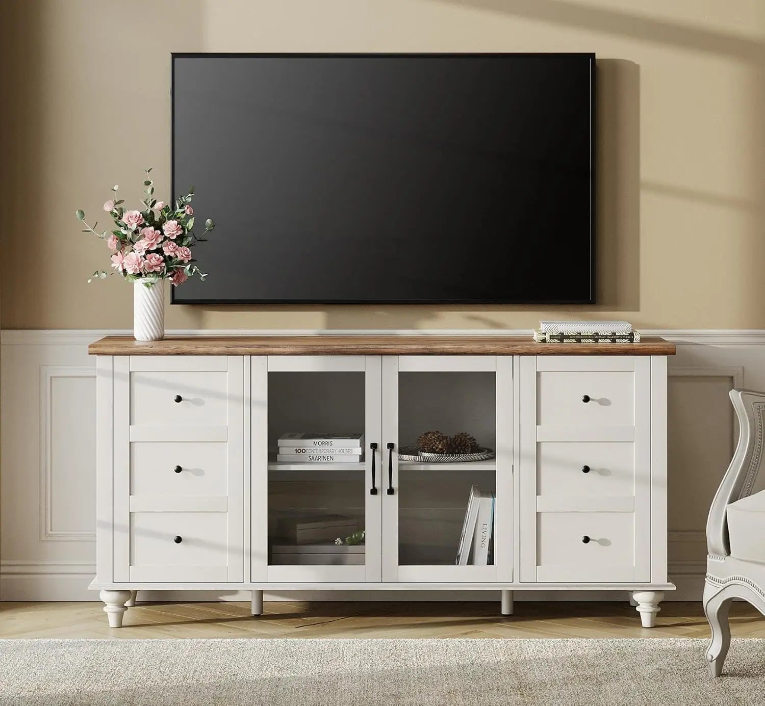 Glass Door Farmhouse TV Stand for TVs Up to 75 inch,Wood Universal TV Console Table with 4 Storage Cabinets,Entertainment Center