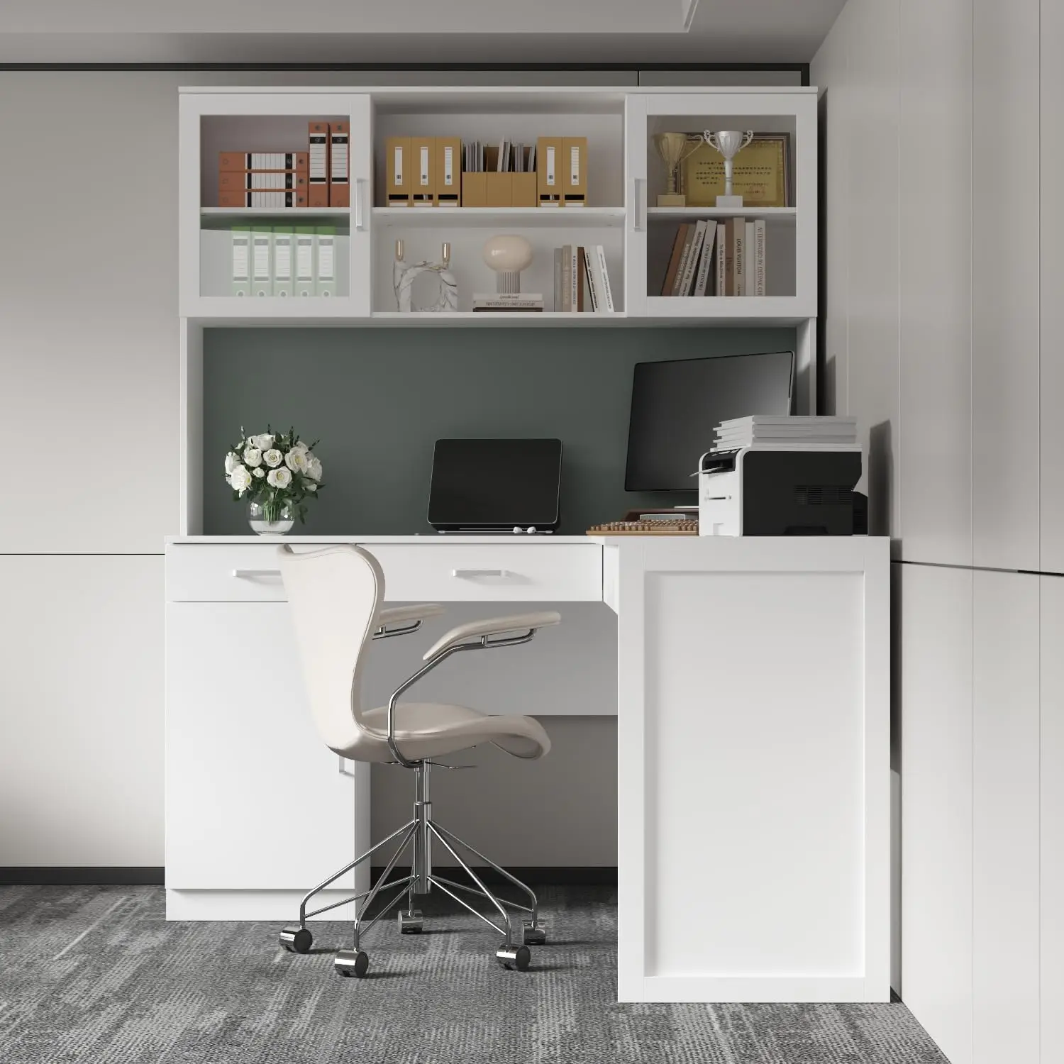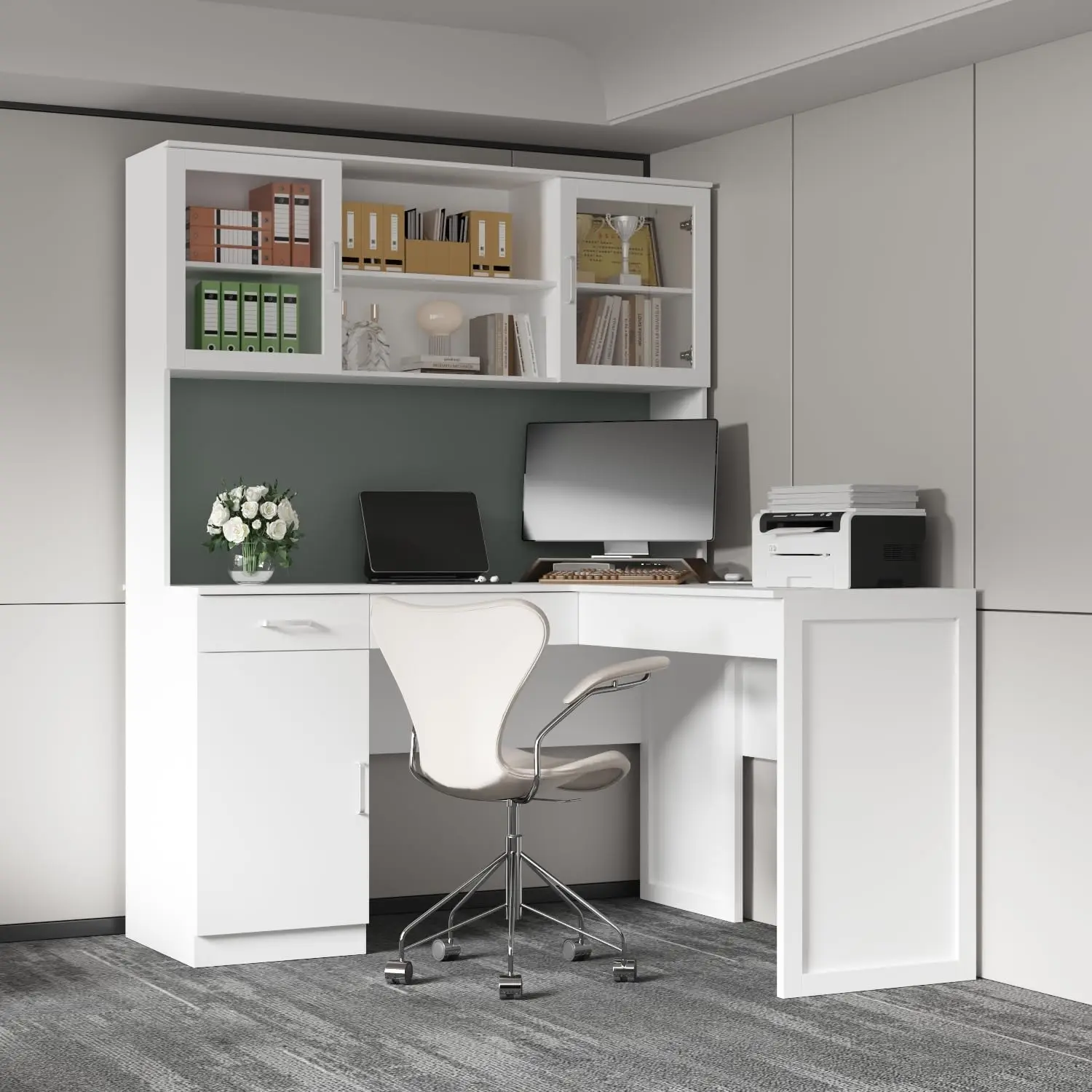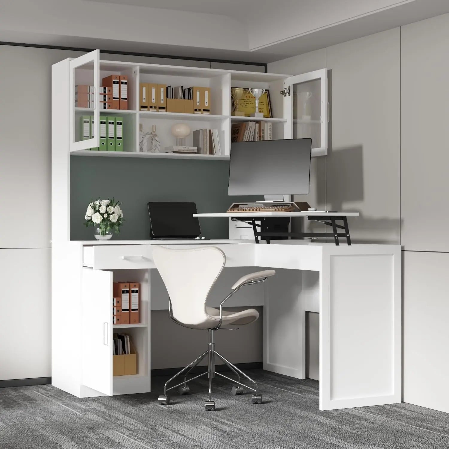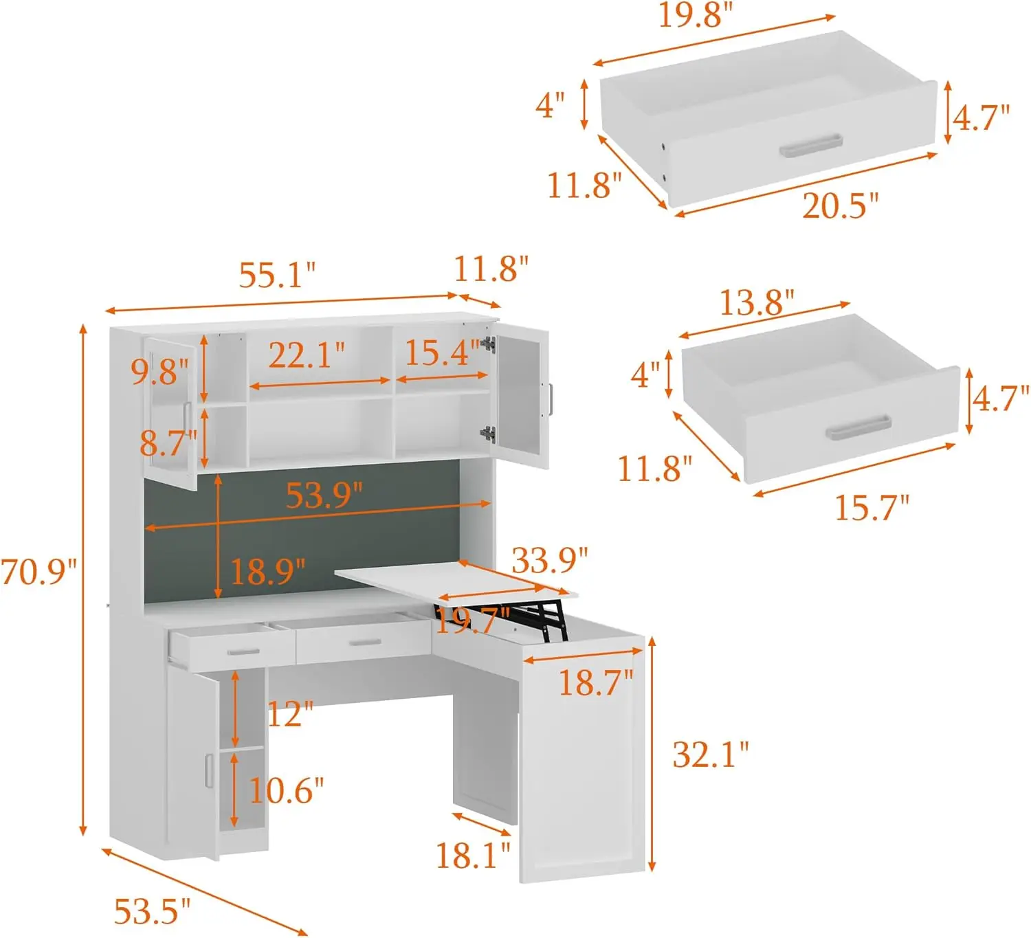 L-Shape Office Desk with Height Adjustable Top, Computer Desk with Drawers and Shelves, Glass Doors, Corner Desk Executive Desk for Home Office Living Room, White, 55.1"D x 53.5"W x 70.9"H