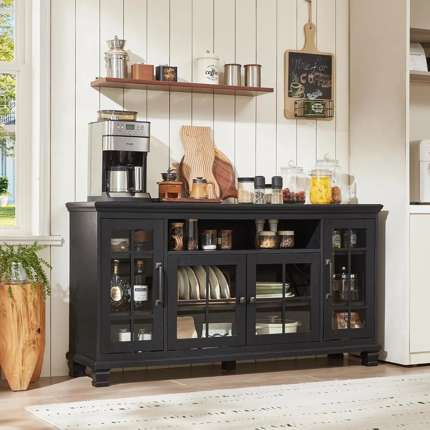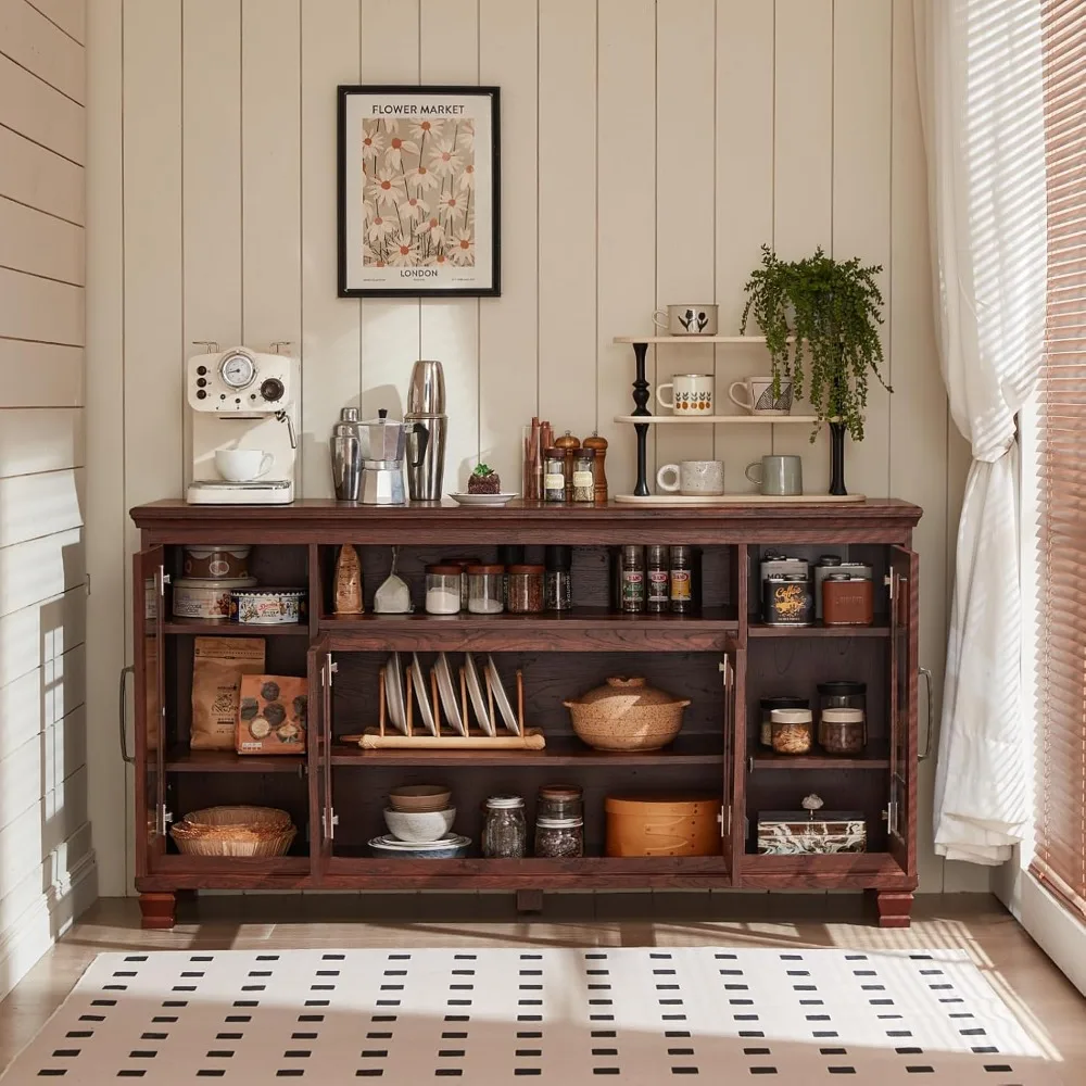 - [Ample & Flexible Storage] This large buffet cabinet features 4 glass doors. Both the large glass doors on the sides and the 2 small glass doors in the middle are equipped with height-adjustable shelves. Additionally, there is a small open storage shelf above the middle small glass doors, providing flexible and diverse storage options for your kitchenware, tableware, condiments, and more.