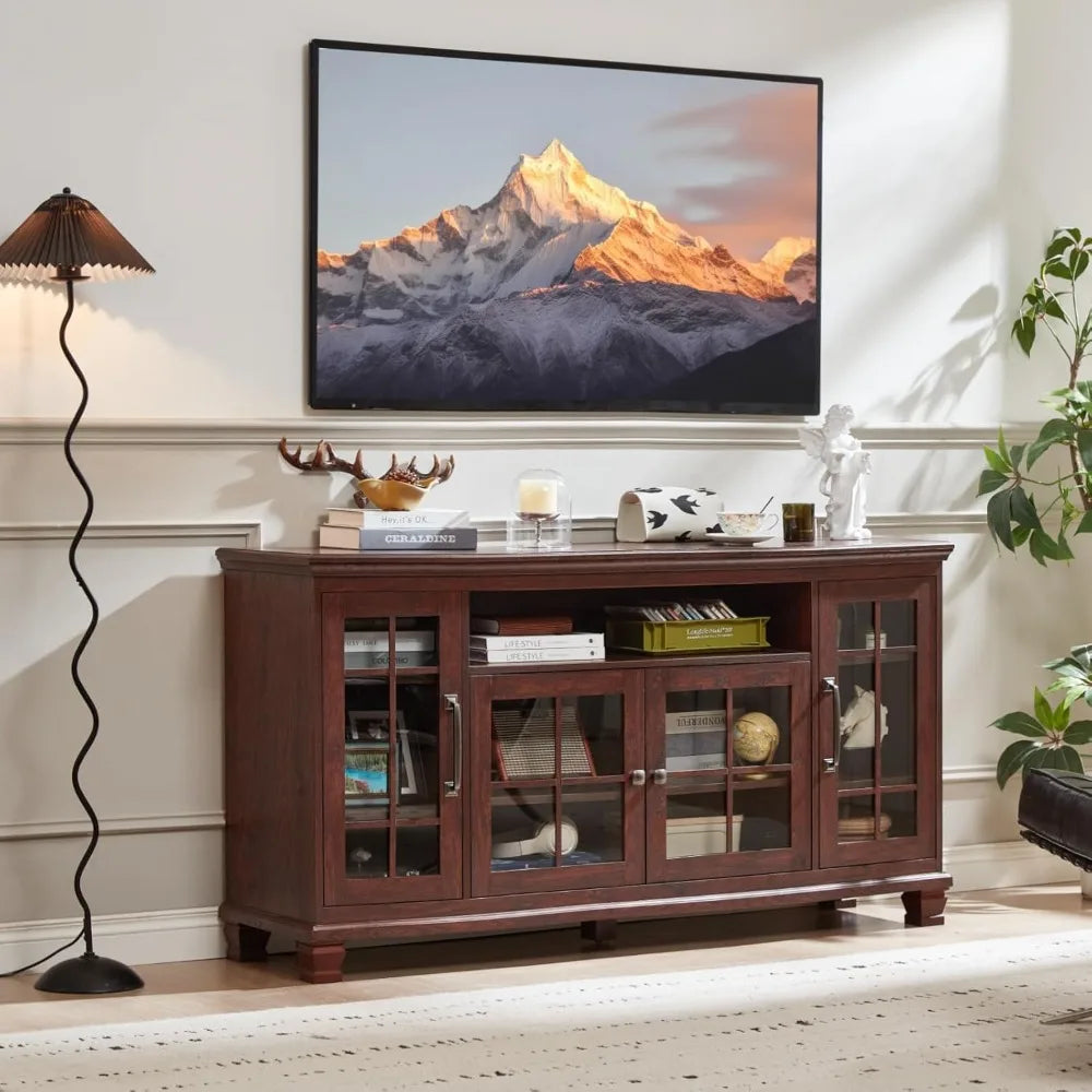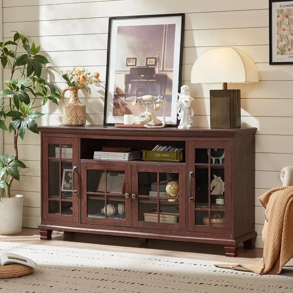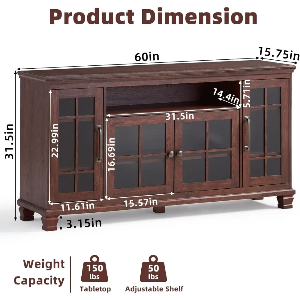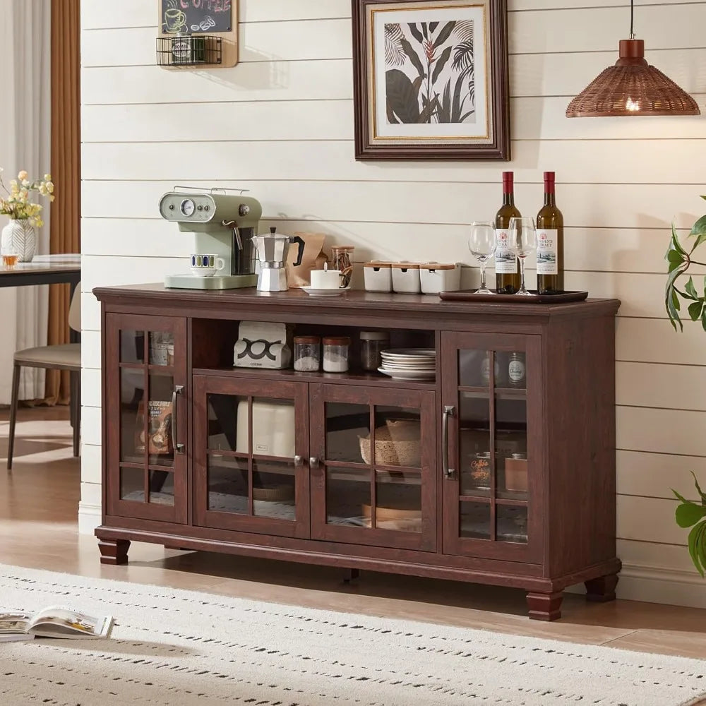 Large Sideboard Buffet Cabinet with Storage, Vintage Walnut Farmhouse 60" Wide Credenza Accent Cabinets with Glass Doors