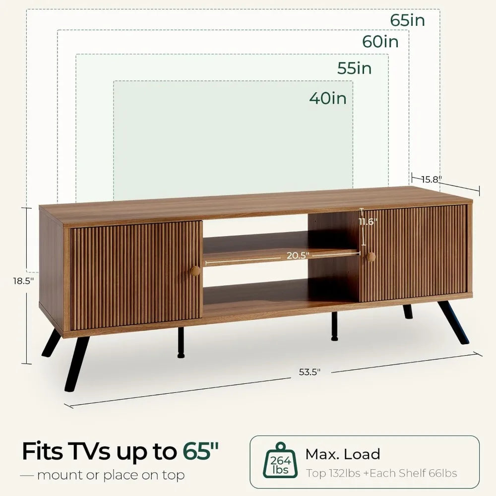 This mid-century modern TV stand embodies a fusion of sleek lines and fluted wave-textured doors, infusing any room with a touch of retro sophistication. Its rich, vintage brown finish harmoniously complements both classic and contemporary settings. Designed to accommodate televisions up to 65 inches, the stand's top surface measures 53.5 inches by 15.8 inches, making it ideal for TVs up to 60 inches. For larger screens, wall-mounting is recommended to achieve a chic, floating appearance above the console. The stand offers smart storage solutions with two enclosed cabinets and an adjustable open shelf, perfect for organizing media, books, or decorative items. Cable management is simplified with built-in rear holes, ensuring a clutter-free setup. Constructed from high-quality P2-grade particleboard and supported by six robust legs, including two adjustable center feet for enhanced stability, this TV stand is built for durability and everyday use. Assembly is a breeze with clear instructions, labeled hardware, and all necessary tools provided, along with an installation video for a seamless setup process. Plus, this TV stand is crafted from FSC-certified wood, ensuring environmental sustainability.