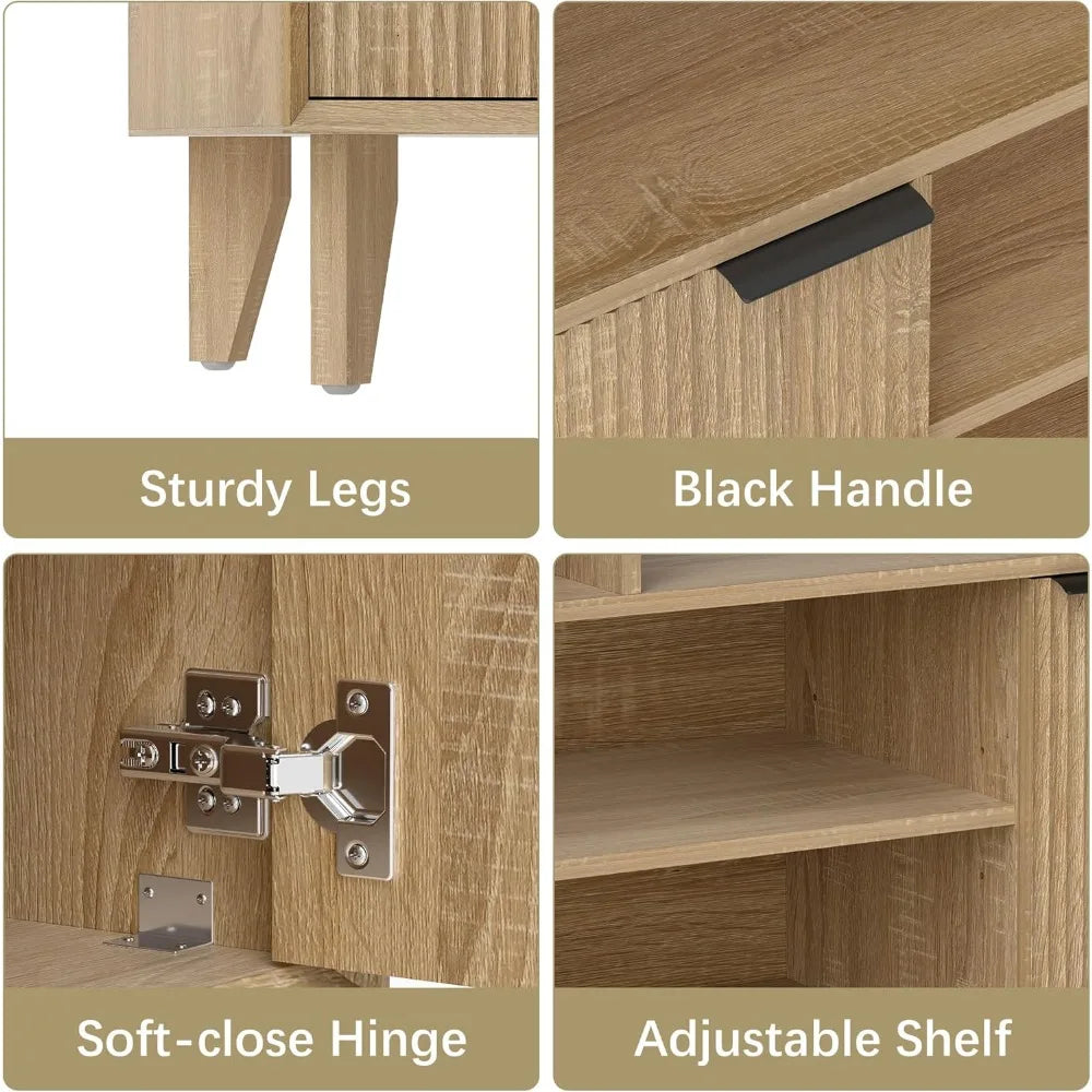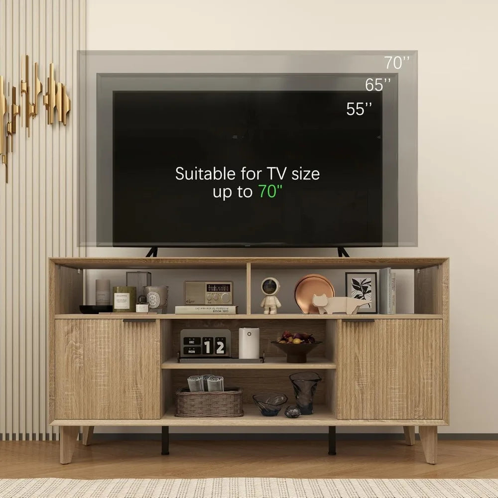 This TV stand, suitable for screens up to 70 inches, is a versatile piece of furniture that can serve as a media console, dining room sideboard, or entryway storage cabinet. It offers optional wall-mounting to save space and features a chic design with hand-finished vertical grooves that create elegant textures. The 45° angled edges give it a refined, floating appearance. The stand provides ample storage with 4 open shelves and 2 large cabinets, perfect for organizing entertainment equipment and decor items. Made from E1-certified MDF and melamine surfaces, it ensures durability and easy maintenance. The 6-inch solid wood legs provide stability. This TV stand comes with all necessary parts, instructions, and tools, and our customer service team is available to assist you within 24 hours if you have any questions.
