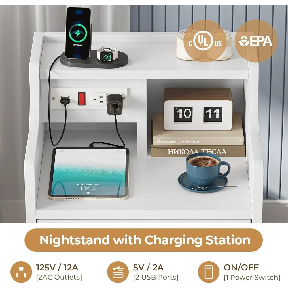 Night Stand Set 2, White Nightstand with Charging Station & Hutch, Night Stands for Bedrooms Set of 2, Bedside Table with