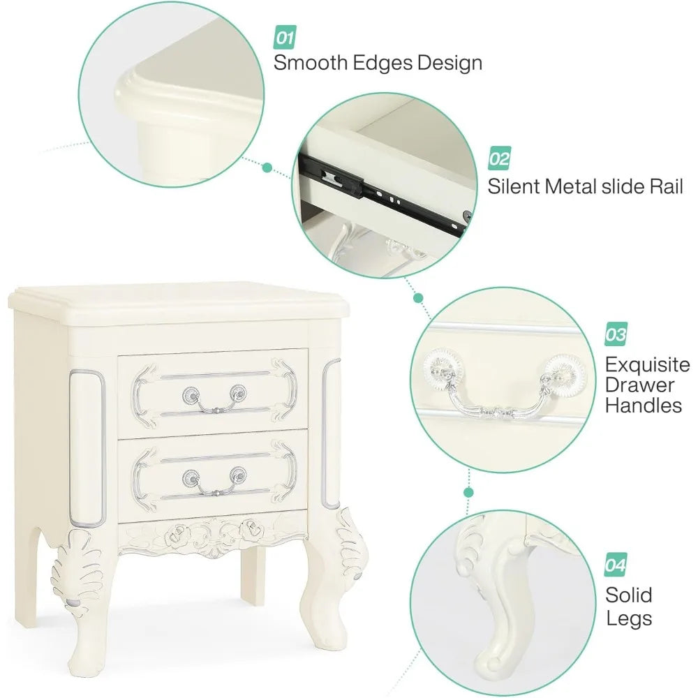 - Classical White Nightstand with Storage: The fusion of a gentle cream-white finish and intricately carved wooden patterns adds an air of elegance and classical charm to this bedside cabinet. This bedside cabinet doubles as an end table/sofa side table/chairside table, the perfect choice for living rooms, bedrooms, and guest rooms