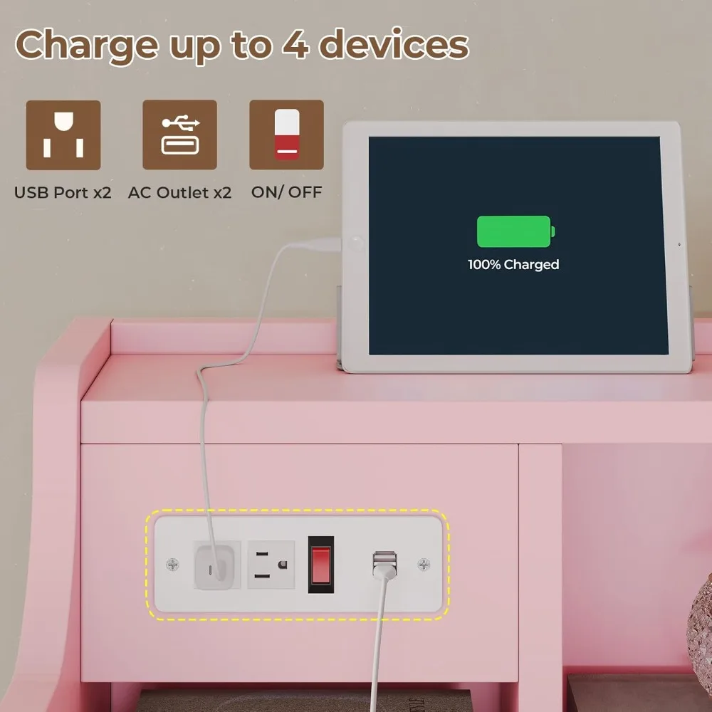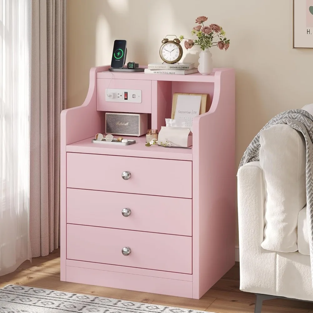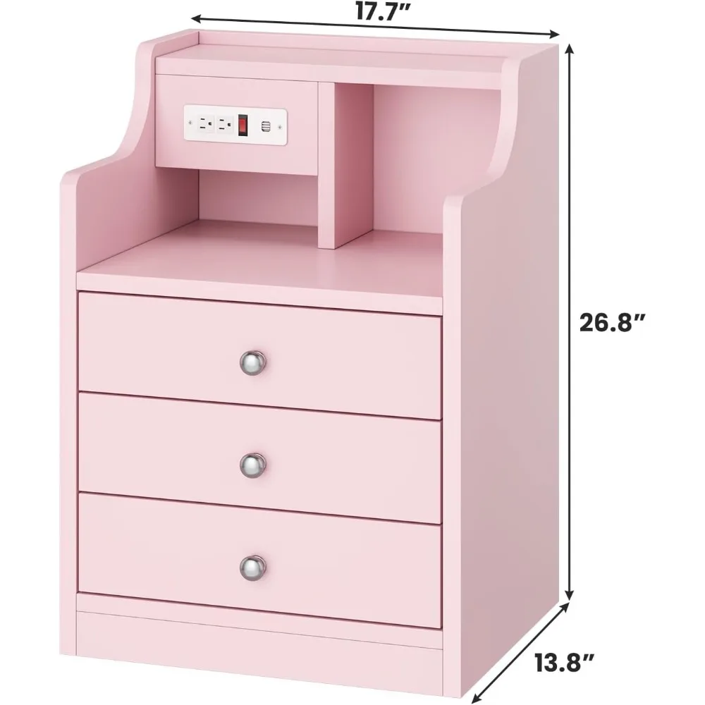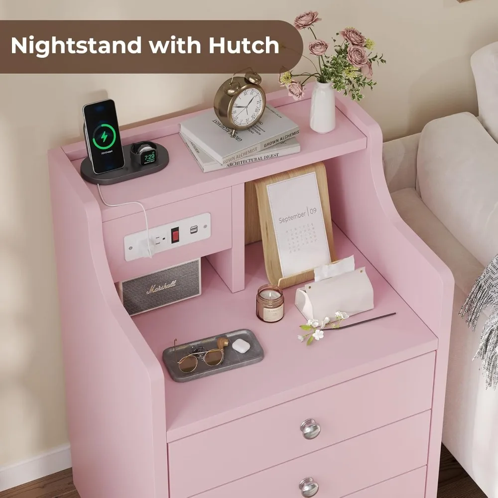 Nightstand with Charging Station, Pink Night Stands with Hutch, 3 Drawers Bedroom End Table Bedside Table with 2 USB Ports