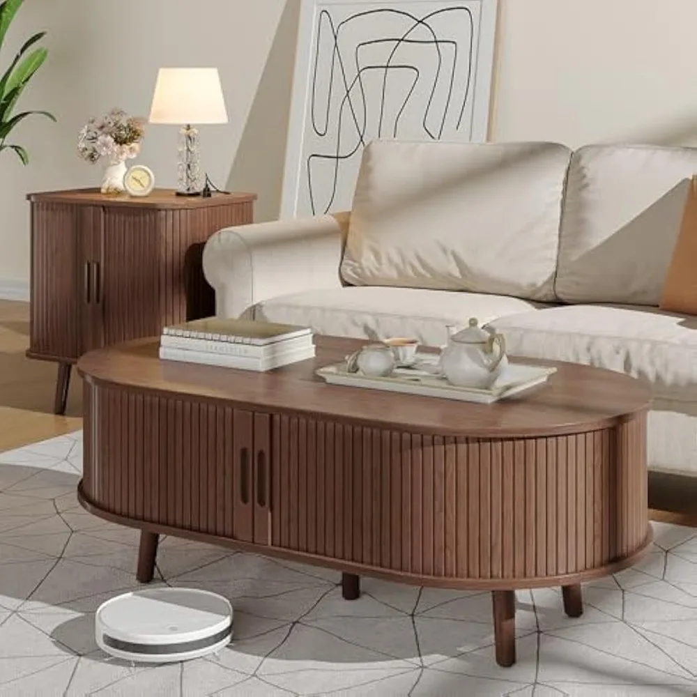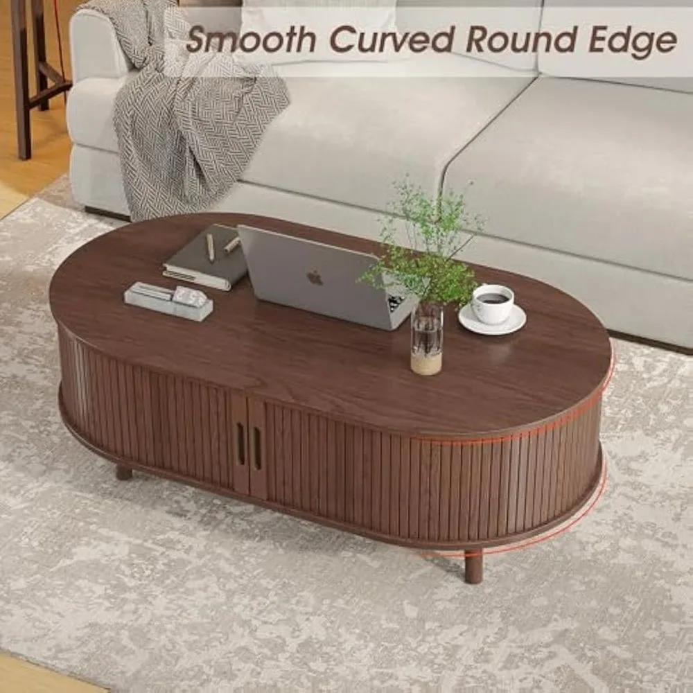 Oval Coffee Table, Mid Century Modern Coffee Table with Sliding Tambour Door, Fluted Center Table with Hidden Storage, Curved P