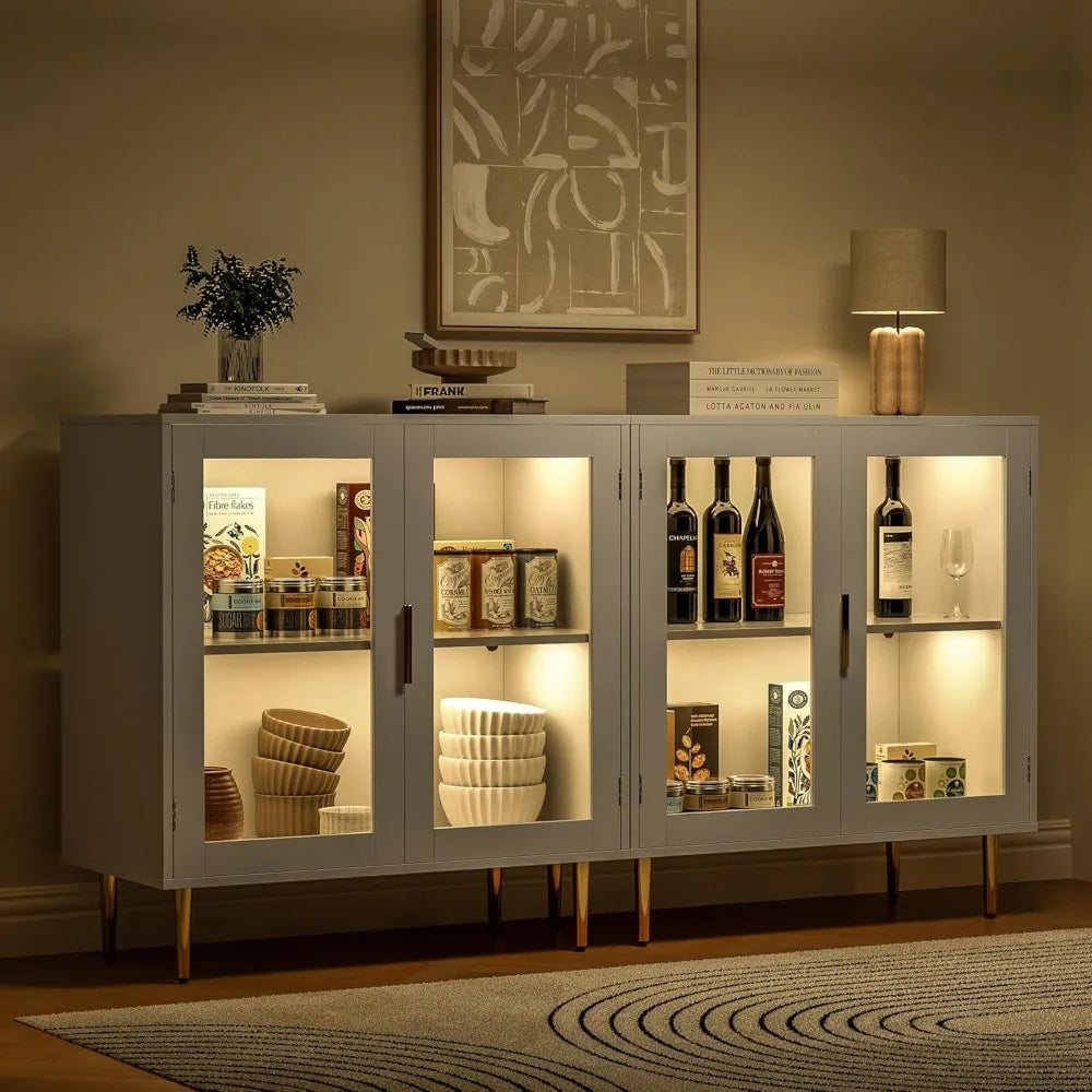 - 【LED Backlight】- This storage cabinet with doors comes with an adjustable LED system, offering 12 colors and various dynamic modes that can be controlled via remote control or its app. Equipped with two light strips, the cabinet can effectively create different atmospheres for your kitchen and dining room, providing an excellent immersive experience.
