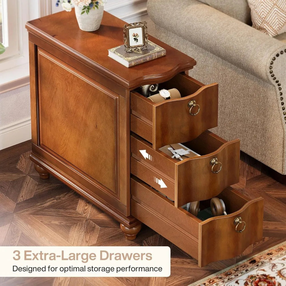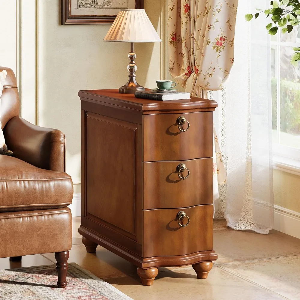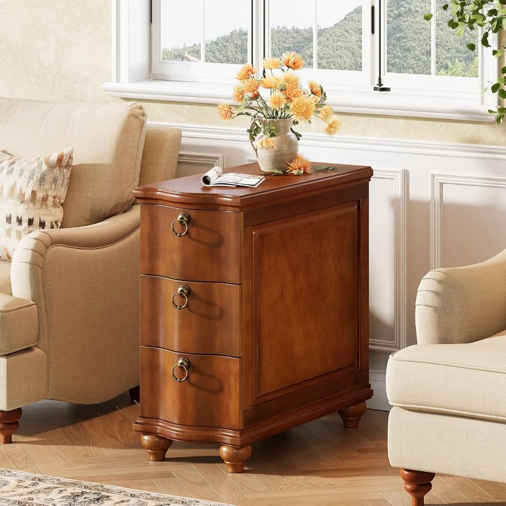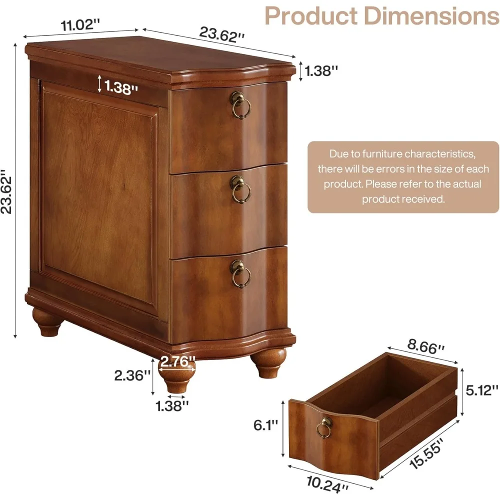 This product features an elegant walnut brown finish that adds a touch of sophistication to any room. The table's polished surface highlights the natural wood grain, making it a versatile piece that suits both traditional and contemporary decor styles. With dimensions of 11.02 inches wide by 23.62 inches deep by 23.62 inches high, this slim side table is perfect for small spaces. It can be used as a bedside table, a sofa-side organizer, or an entryway catchall, making it ideal for apartments and cozy spaces. The table arrives fully assembled, so you can start using it right away without any need for tools or complicated setup. This makes it a hassle-free option for quick room updates, new homes, or preparing for last-minute guests. It offers ample storage with three spacious drawers, keeping essentials organized and clutter concealed. This is perfect for decluttering living rooms or creating a tidy bedside storage solution. Built to last, the table is constructed with medium-density fiberboard (MDF) and solid wood legs, providing a sturdy base that can support up to 200 pounds. It is resistant to warping, ensuring that it remains sturdy and beautiful for years to come, while easily supporting heavy items.