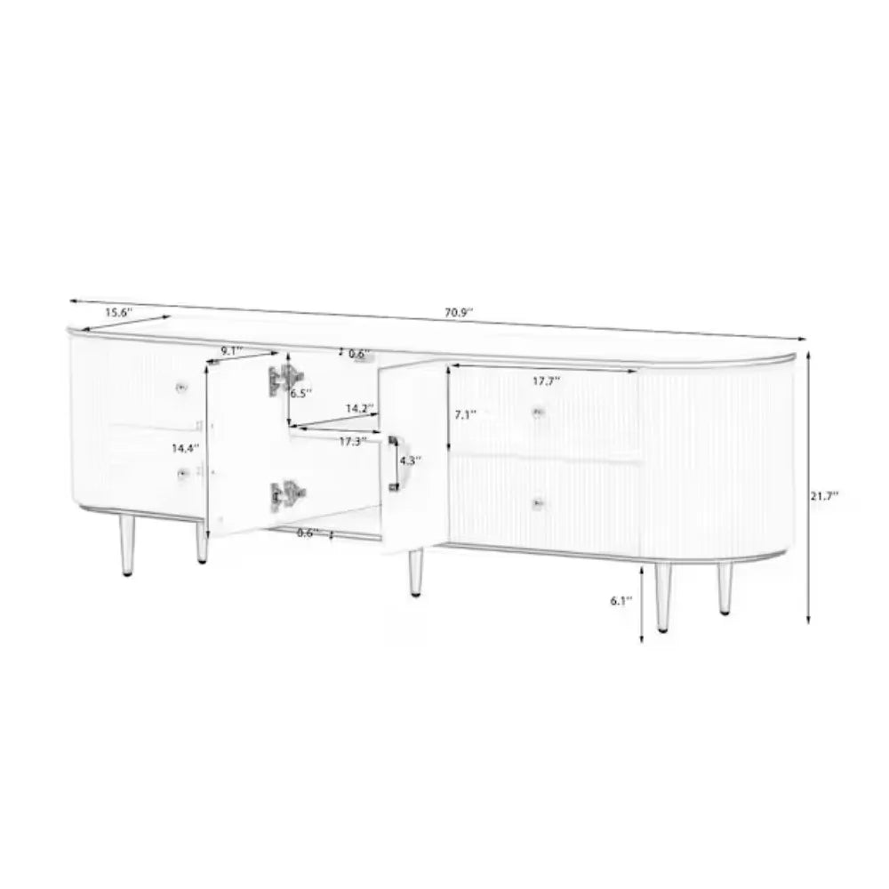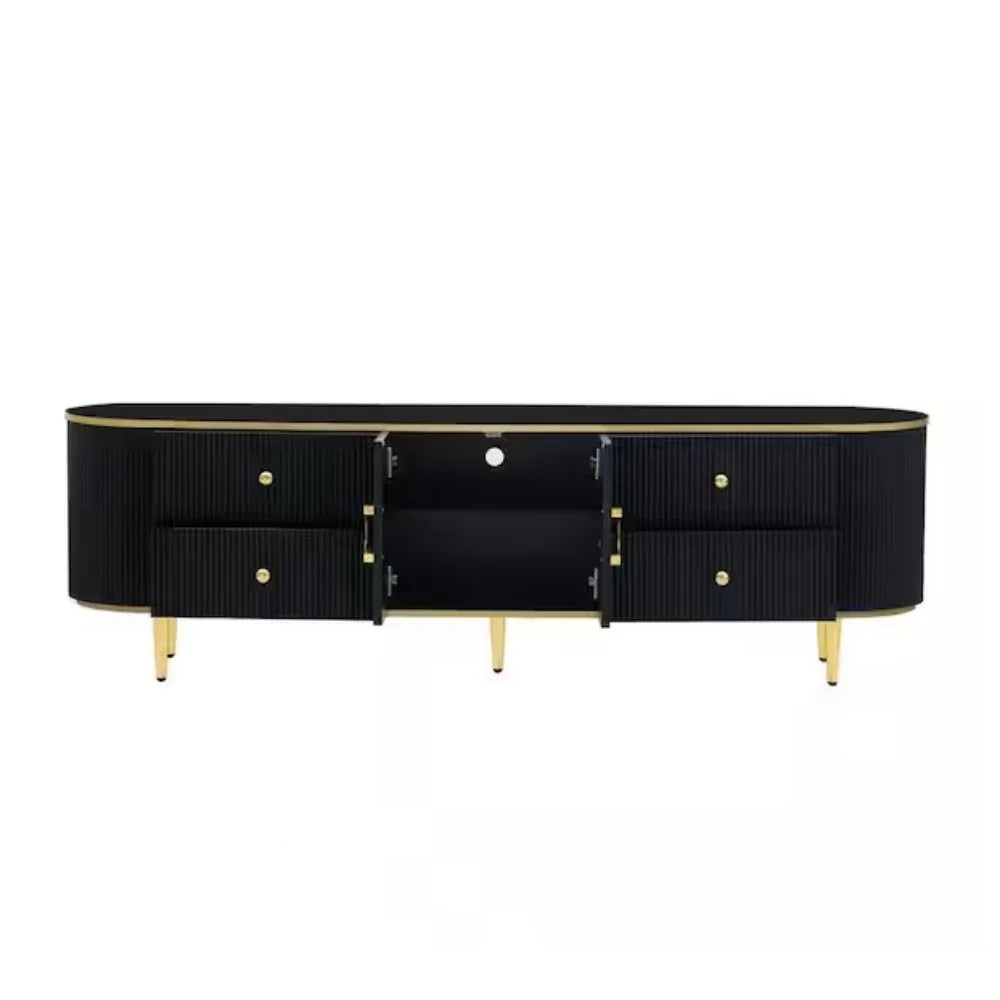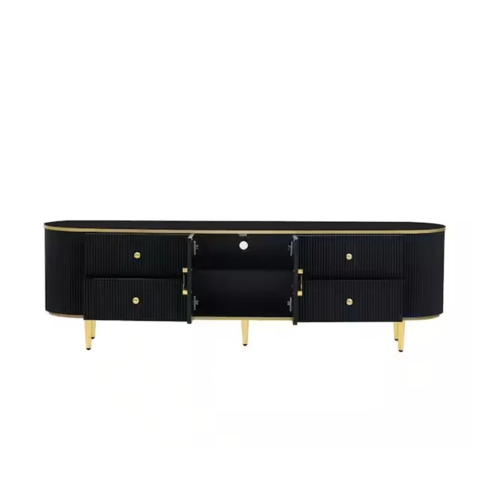 Introduce contemporary elegance to your entertainment space with our Modern Curved TV Stand. It is designed with vertical grooves on the overall body, the top and bottom panels are adorned with gold edges, complemented by 5 metal cone-shaped feet that provide both stability and style. Crafted with a blend of modern aesthetics and practicality, it's the perfect addition to elevate your living room or entertainment area.